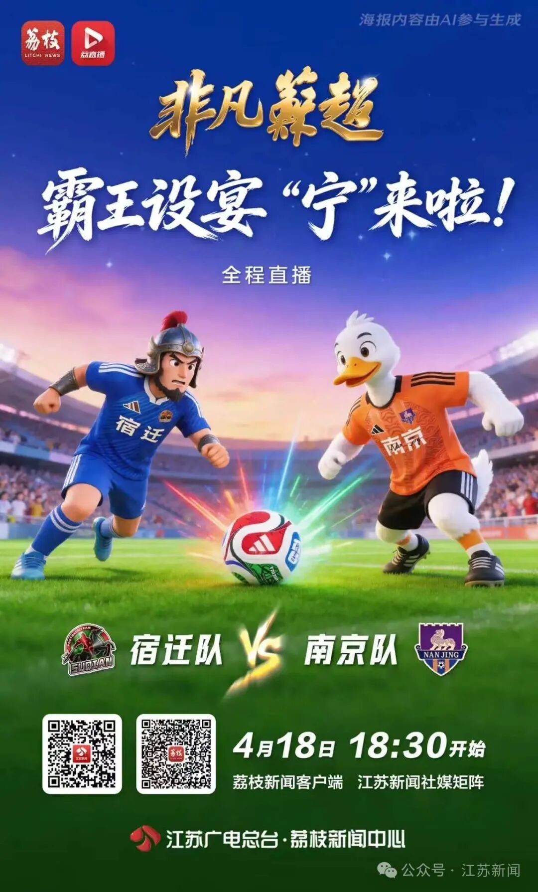这场比赛看点满满,饰演“霸王”的演员何润东将出现在宿迁主场的暖场环节,为两支队伍加油助威。