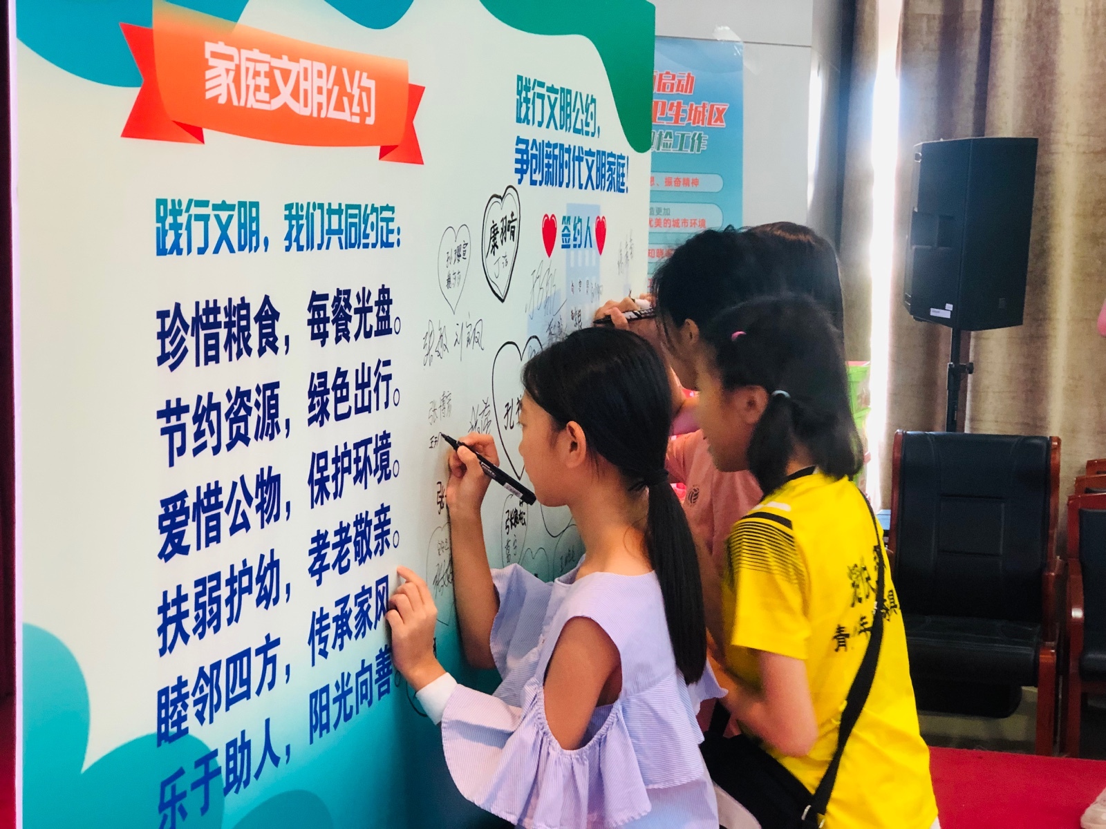 在文明公约签约环节,30组家庭共读“家庭文明公约”并依次上台进行“签约”。从自身做起,关爱身边邻里,共建美好社区,保护绿色环境,争创文明家庭。