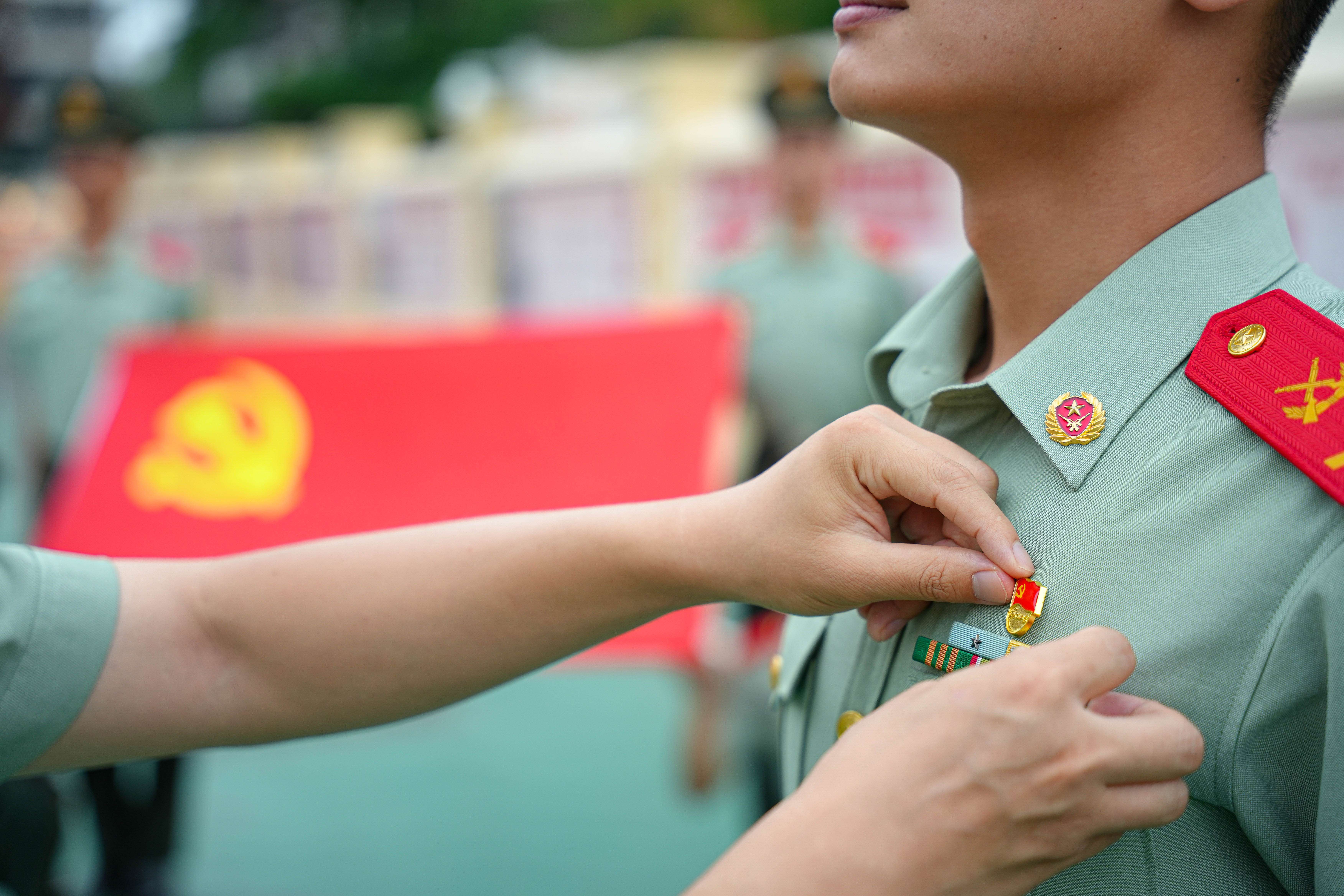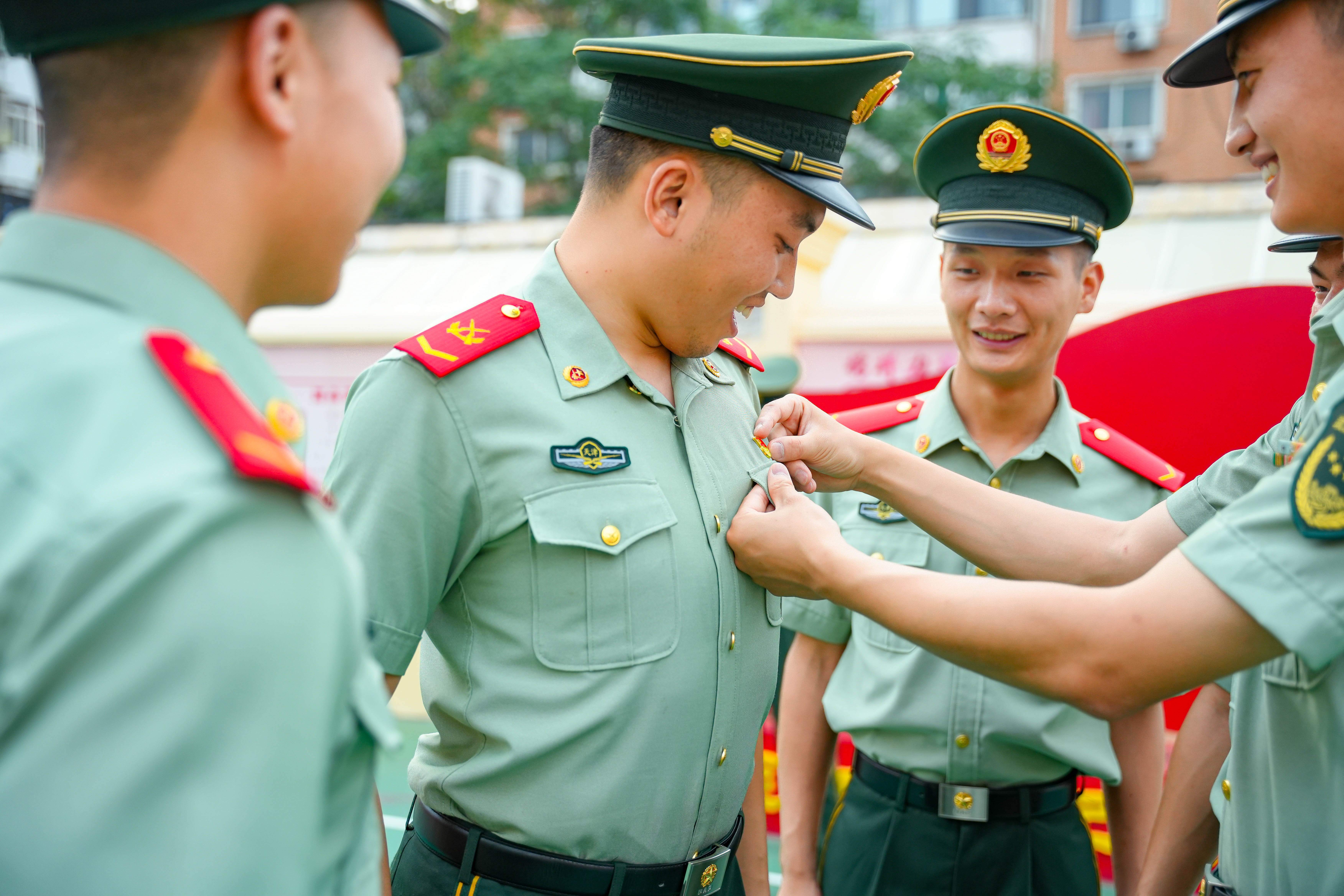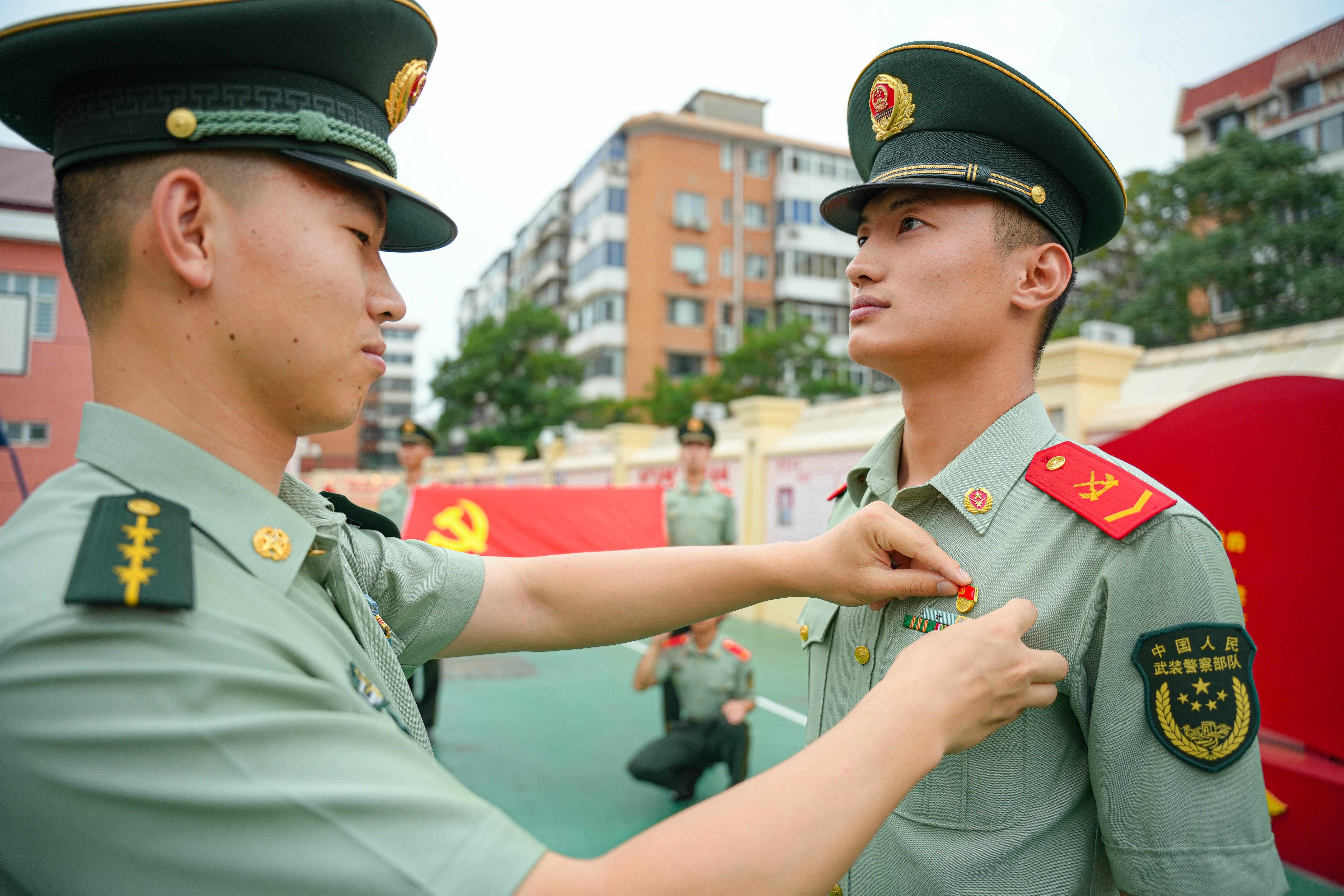 2025年7月1日,武警天津总队执勤第二支队官兵正在组织为新党员佩戴党员徽章活动。