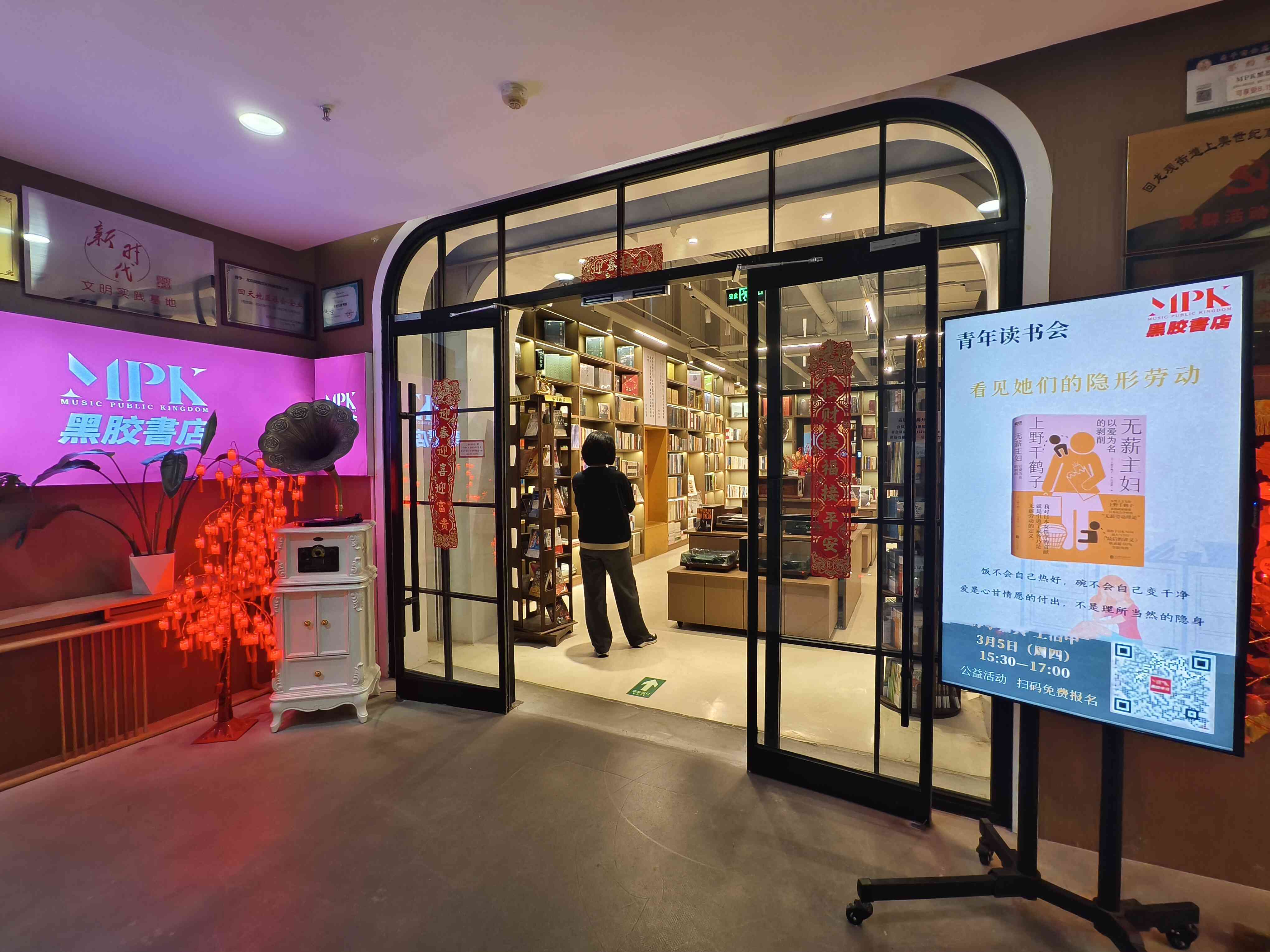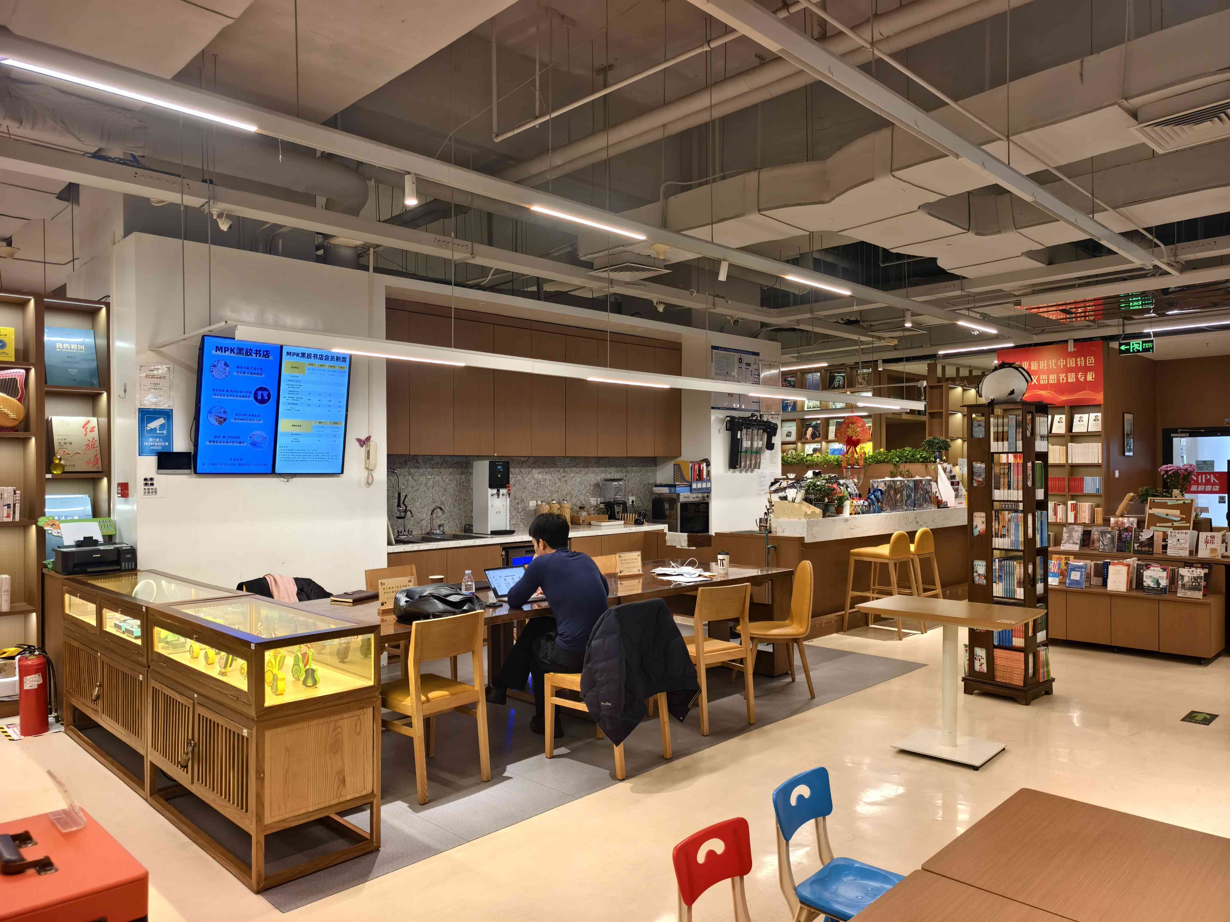 MPK黑胶书店自2020年成立以来,便秉持“让生活节奏慢下来,回归本真状态”的核心理念,跳出传统书店“书籍销售”的单一定位,致力于构建沉浸式的慢生活体验载体。空间布局尽显巧思,散消区、会员区、活动区独立区隔,互不打扰:散消区流淌着轻柔的音乐,读者可伴着旋律品一杯现磨咖啡,与友人闲谈交流;会员区静谧雅致,满足专注阅读、静心思考的需求;活动区为可容纳近百人的多功能活动厅,灯光、音响、液晶显示屏一应俱全,成为附近居民文化交流的重要阵地。