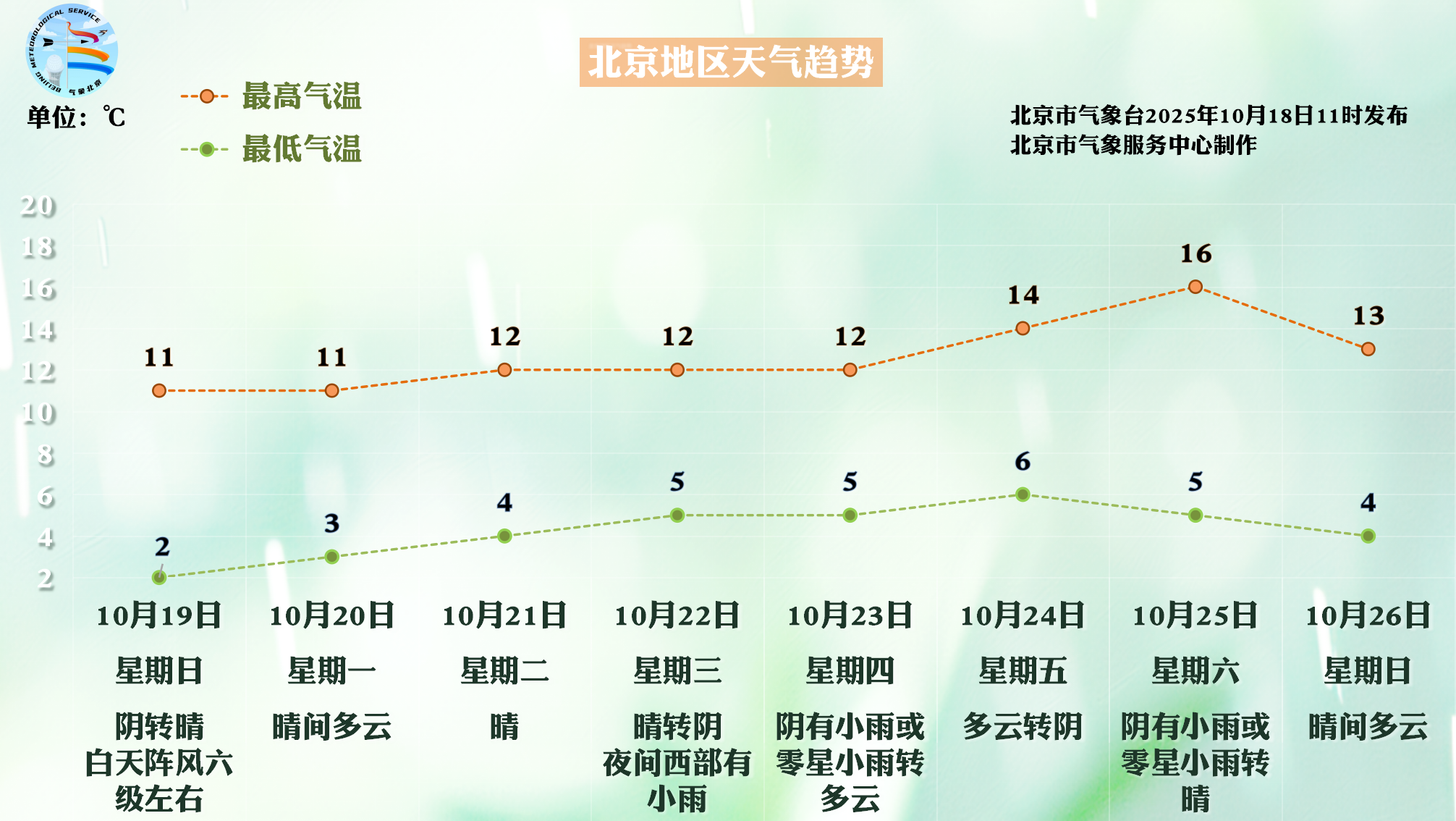 北京市气象台18日14时发布,今天白天多云转阴,北转南风二三级,最高气温11℃;夜间阴,西部北部有小雨或雨夹雪,高海拔山区有雪,南转北风二三级,最低气温5℃。寒潮蓝色预警中,气温低迷,注意添衣保暖;西部北部注意防范雨雪天气。