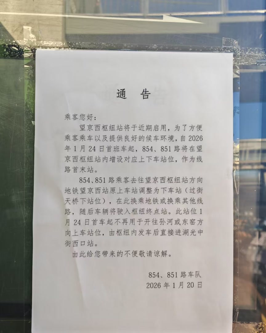 20日上午,居住在望京西地铁站周边的一位市民高兴地告诉记者:“昨天得知消防通过验收的消息后,我今天也去枢纽周边转了一圈,发现位于枢纽东侧的854、851路公交总站已经贴出通知,说是望京西枢纽站将于近期启用,从1月24日起这两条线路也将把首末站迁入枢纽内。”
