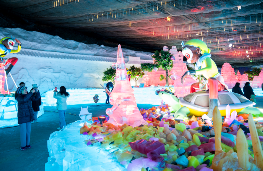 冰灯展区将“大闹天宫”的奇幻世界搬进冰雪峡谷,“灵猴现世”“龙宫借宝”“大闹天宫”“马上封侯”四大展区串联起完整故事线。20余组大型主题冰建筑与150余件精美冰雕作品,精准还原了动画中的奇幻场景。