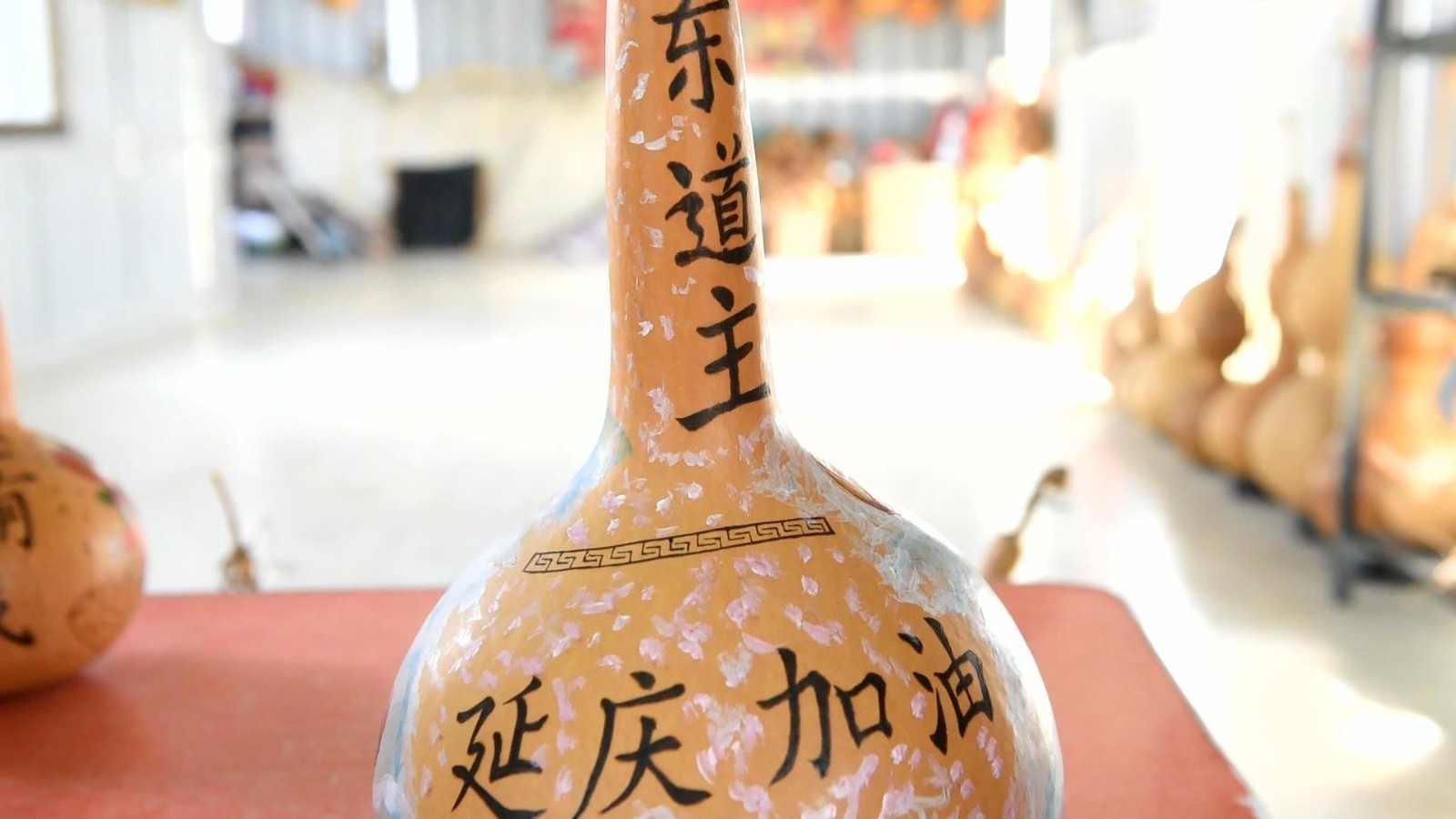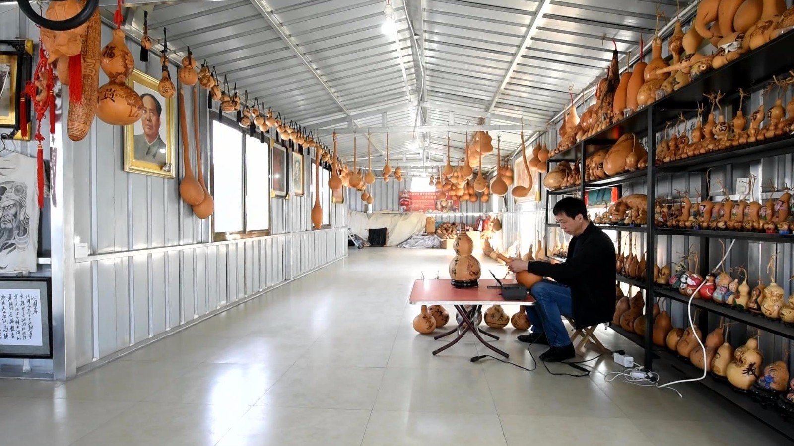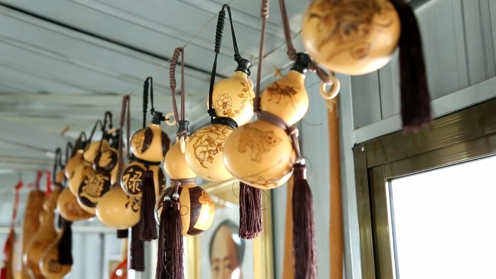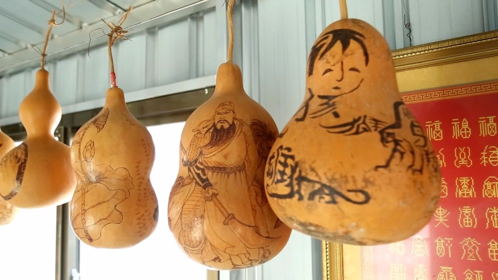 在张祝学的工作室,形态各异大小不一的葫芦吊满了整个房间,靠墙的展架上,画好的葫芦烙画题材丰富、形制各异。张祝学是绘制葫芦烙画的多面手,他画的昆虫野趣横生,各种技法娴熟,民间传说刻画精细、情节丰富…… 除了精湛的绘制技术,张祝学还善于根据葫芦的本身造型制作葫芦烙画。