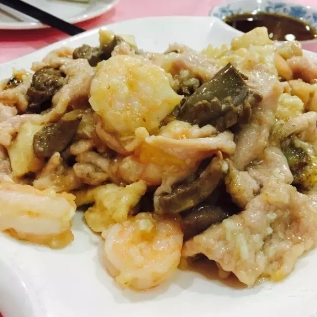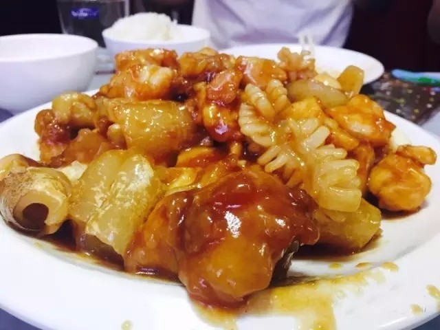 独面筋,老爆三是每次必点,传统的天津菜,味道没话说!这里要特意提一道天津最具海陆空混搭风的家常菜——全爆,每次服务员端上来的全爆的用料都不一样,餐馆里有什么食材就混搭什么,不拘一格。相同的是操作手法:旺油爆汁,口味咸鲜,营养丰富,食之难忘。
