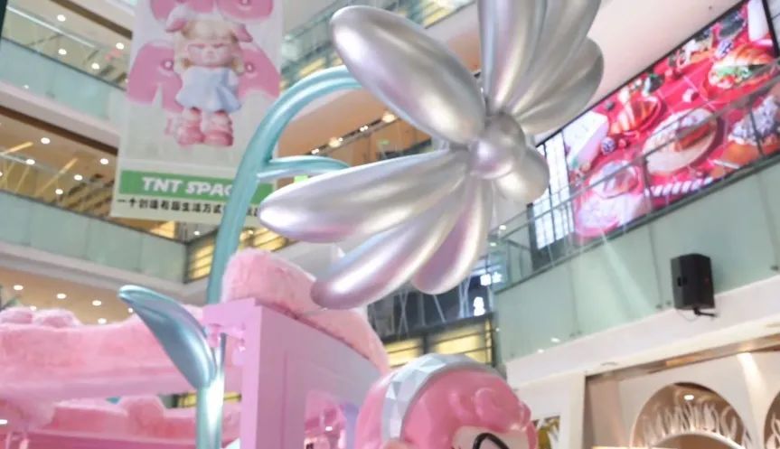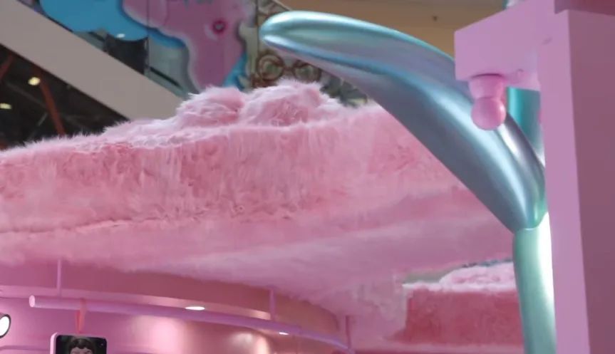 一进入大厅,就会被5m高的巨型DORA吸引视线,潮酷又梦幻,无论哪个角度都很出片。旁边设立粉色车厢,整辆车都是毛茸茸软乎乎的触感,坐在车里仿佛登上了开往奇幻世界的列车。