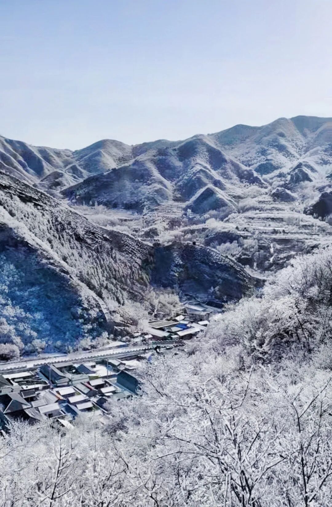一场春雪悄然而至,为古老的长峪城披上洁白盛装,瞬间化身冰雪童话世界,延续着元宵未尽的浪漫。枝头琼花缀满冰晶,宛如玉雕,在湛蓝天空下,雪覆群山与古村相映成趣,放眼望去,满目皆是诗意。