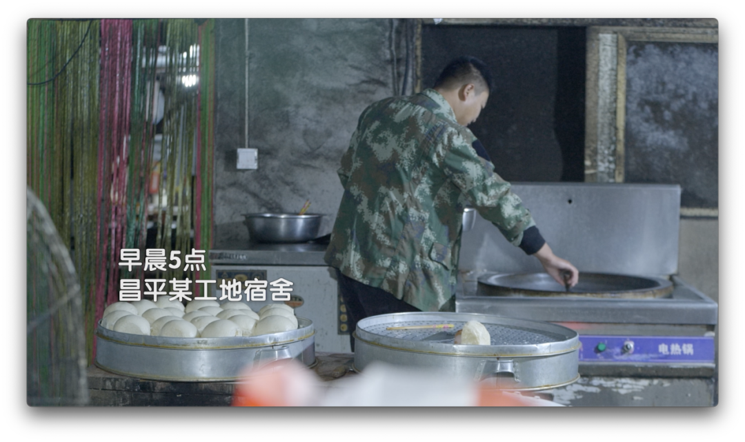 早晨5点钟,天还是完全黑的,工人们就已经吃完早饭,早早地待在了车里,有人在刷手机,有人在闭着眼打盹。这天的早饭是馒头、稀饭和咸菜。他们需要5点半乘车出发,5点50到工地集合,6点开始干活。