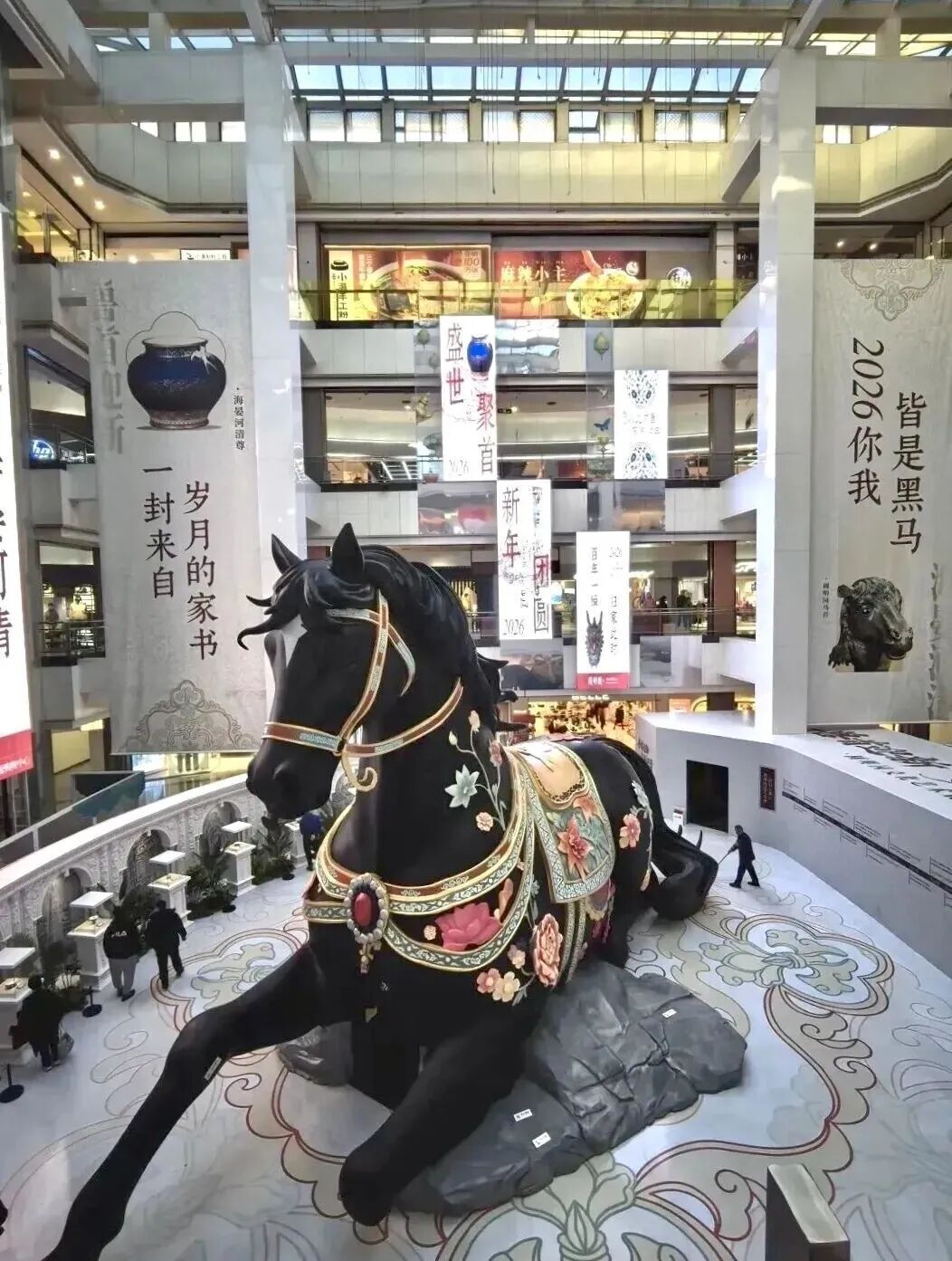 世纪金源购物中心商场二层中庭的黑色巨马