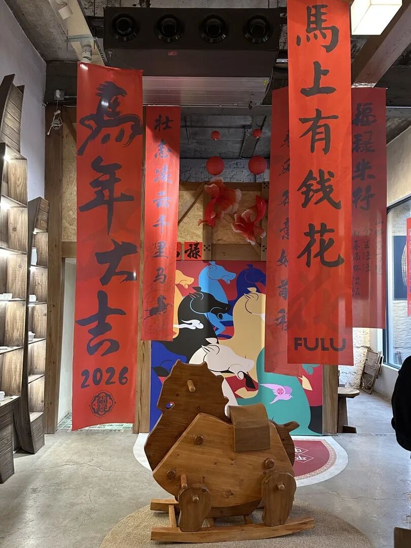 胡同深处,“马”也随处可见。在法源寺街区烂缦胡同南口的宣南书店,明亮的大落地窗上已经贴上“2026马上有钱”“马上开心”的卡通贴纸;二楼天台上,一匹胖嘟嘟的白马俯身探出,两只前蹄捧住一个大大的红福字,喜庆模样惹人喜爱。