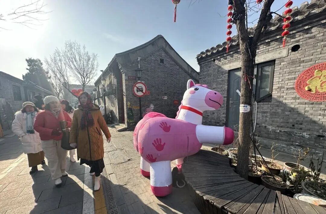 沿着胡同往里走,七井胡同交叉口粉白相间的卡通充气小马格外吸睛。它歪着脑袋、斜侧身子,萌态十足,成了整条胡同里最热门的打卡点。马屁股上印着几个粉红色的手掌印,更是让人忍俊不禁。“拍拍马屁,新的一年快马加鞭!”,在这里打卡拍照也有吉祥寓意。
