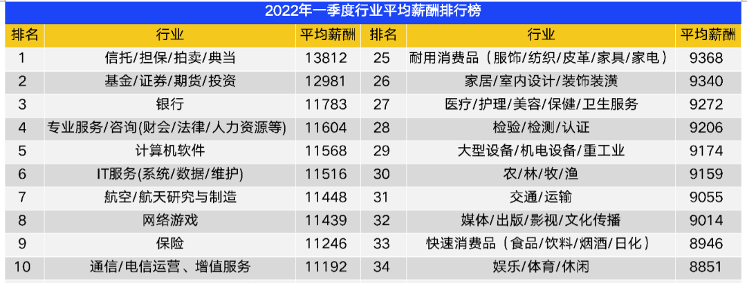 行业方面来看,一季度金融和信息技术行业薪资仍亮眼。信托/担保/拍卖/典当、基金/证券/期贷/投资、银行业薪资位列前三。计算机软件、IT服务等行业的薪资优势明显。