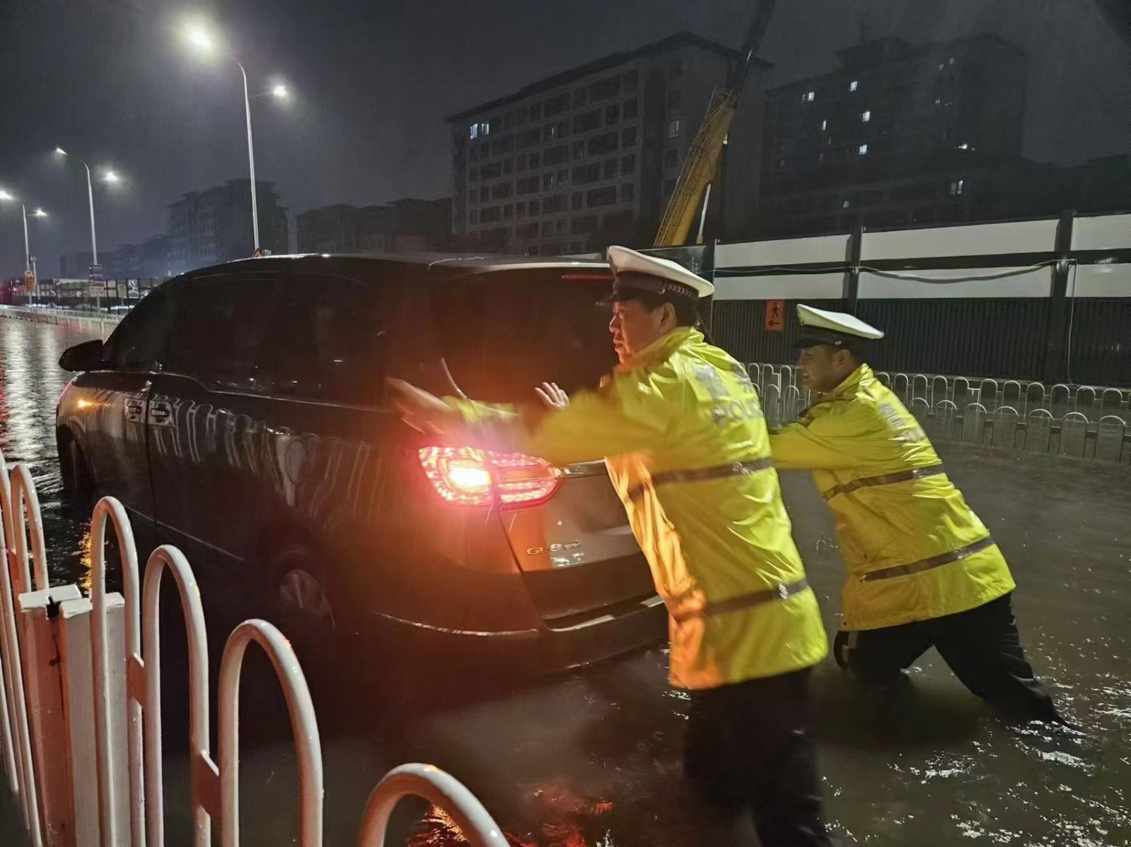 受积水影响,多辆车辆涉水抛锚,出现被困情况。在各区域巡查的民警发现后,先后手推涉水车辆十余辆、帮助司机脱困。