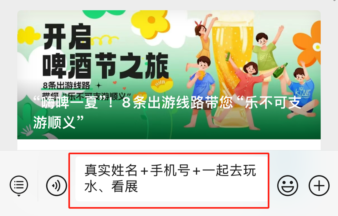 发送“真实姓名+手机号+一起去玩水、看展”至“北京顺义”微信公众号,即可参与抢票。