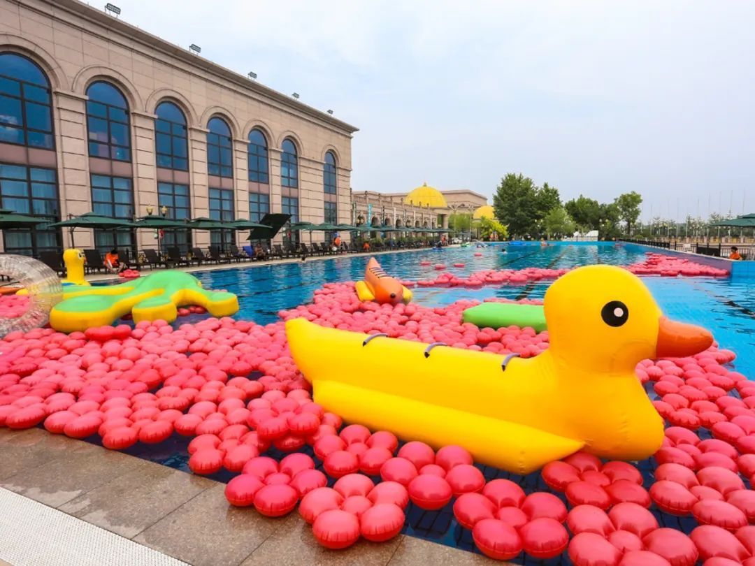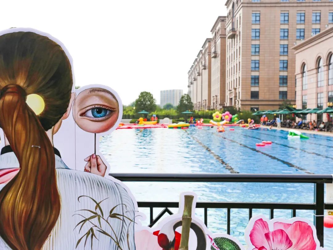 艺术泳池面积约1500平方米,设有充气浮床、充气船等多个水上娱乐项目,现场还设置儿童专区,水位最深0.8米。泳池整体氛围充满艺术气息,大面积鲜艳的色调,在体验清凉夏日的同时,还能带来视觉的冲击。