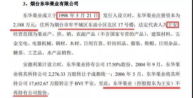 东华果业注册时间是在1998年5月21日,而安德利有限第一次股权转让是在1998年10月。招股书没有披露东华果业当年经营情况,东华果业注册5个月,就发生了股权转让。