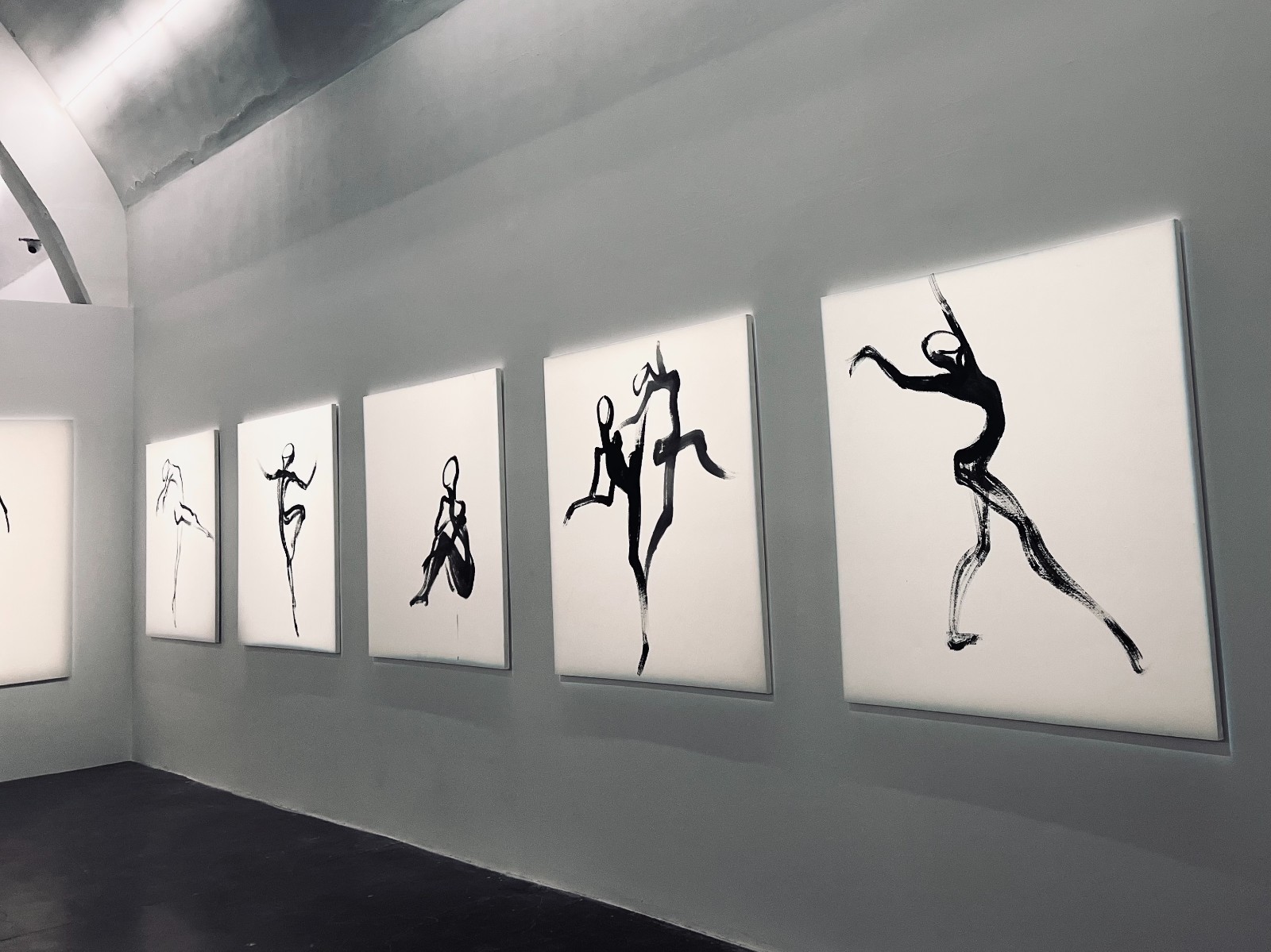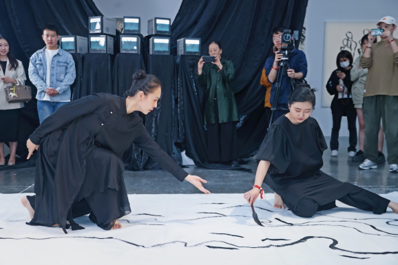 展览发起人,艺术家孔令颜随后以《源头活水》为题现场作画,并结合舞蹈家魏佩璇的形体艺术进行跨界呈现。