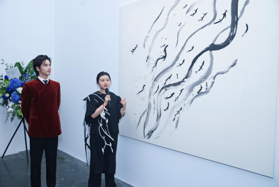 开幕式现场,北京尤伦斯当代艺术基金会负责人陈睿先生,艺术共创公益大使许魏洲先生,艺术家孔令颜女士,参展艺术家王晨皓先生先后致辞。中国女画家协会会长孔紫女士、时尚芭莎明星总监王晓白女士、著名主持人史林子女士等嘉宾出席。