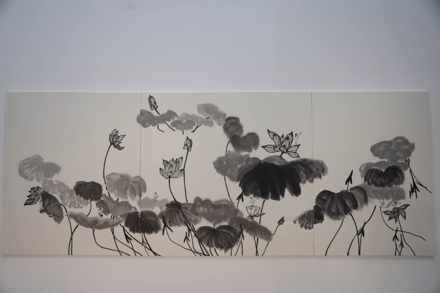 艺术展陈作品分为三个单元,分别是孔令颜的传统大写意水墨作品、王晨皓的现代艺术装置和许魏洲的音乐艺术《CrossFever交互热爱》等,三种文化艺术的碰撞旨在达到和自然万物同频共振。其中《万物自应•源头》是艺术家孔令颜与音乐创作者许魏洲、《棒!少年》的孩子们共创的水墨写意作品。