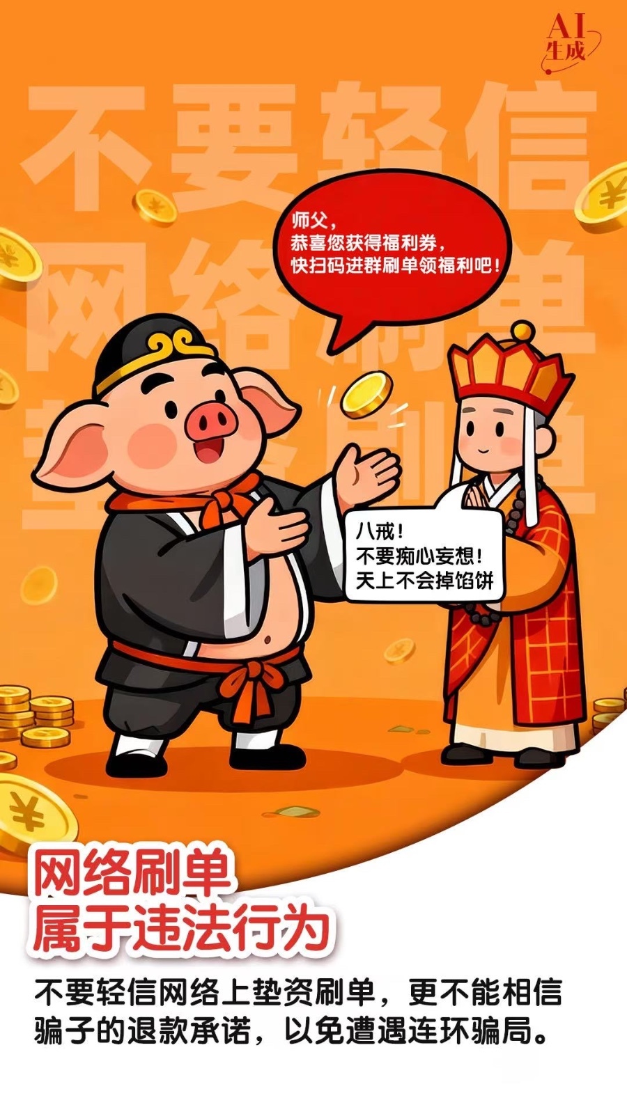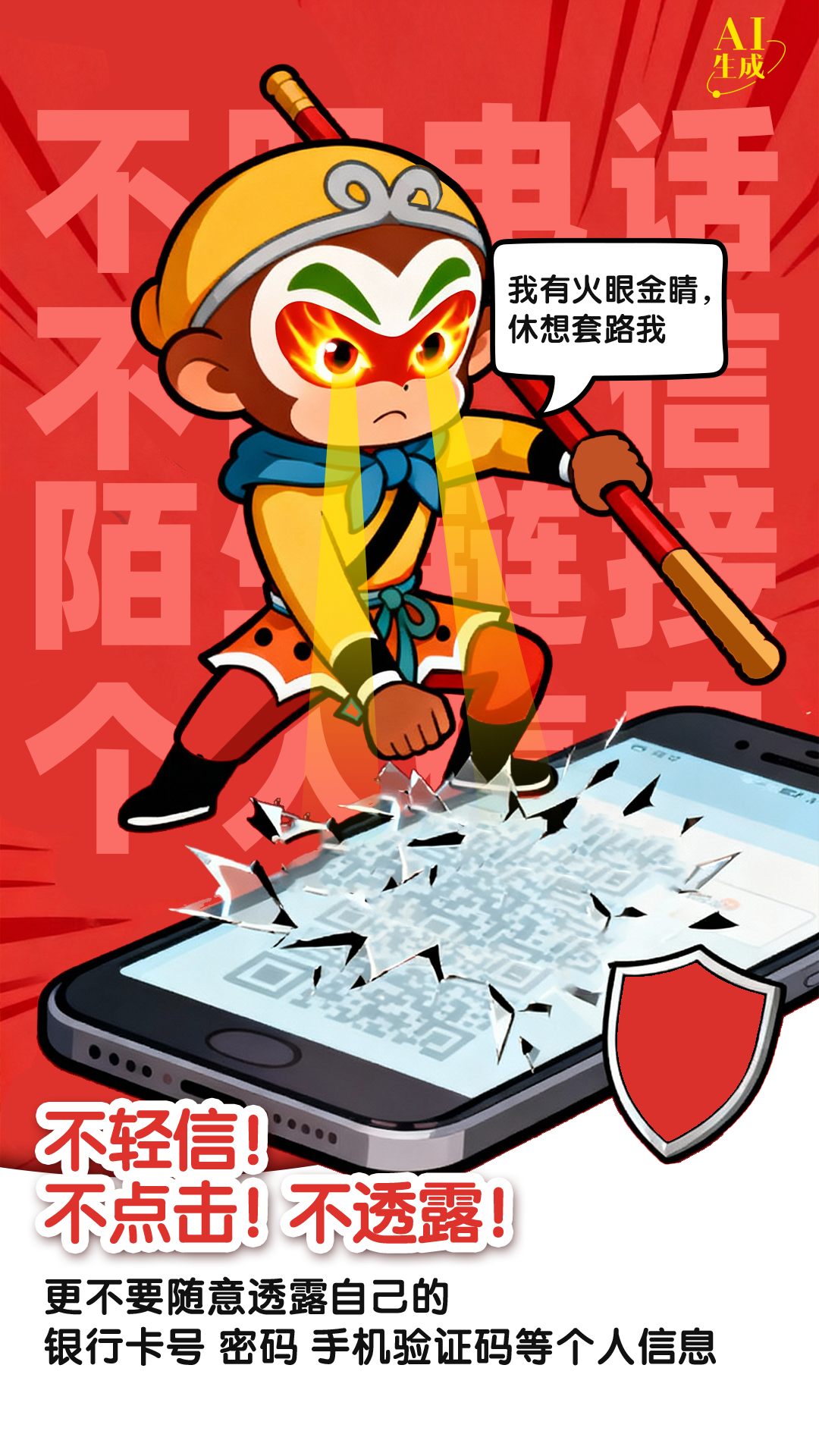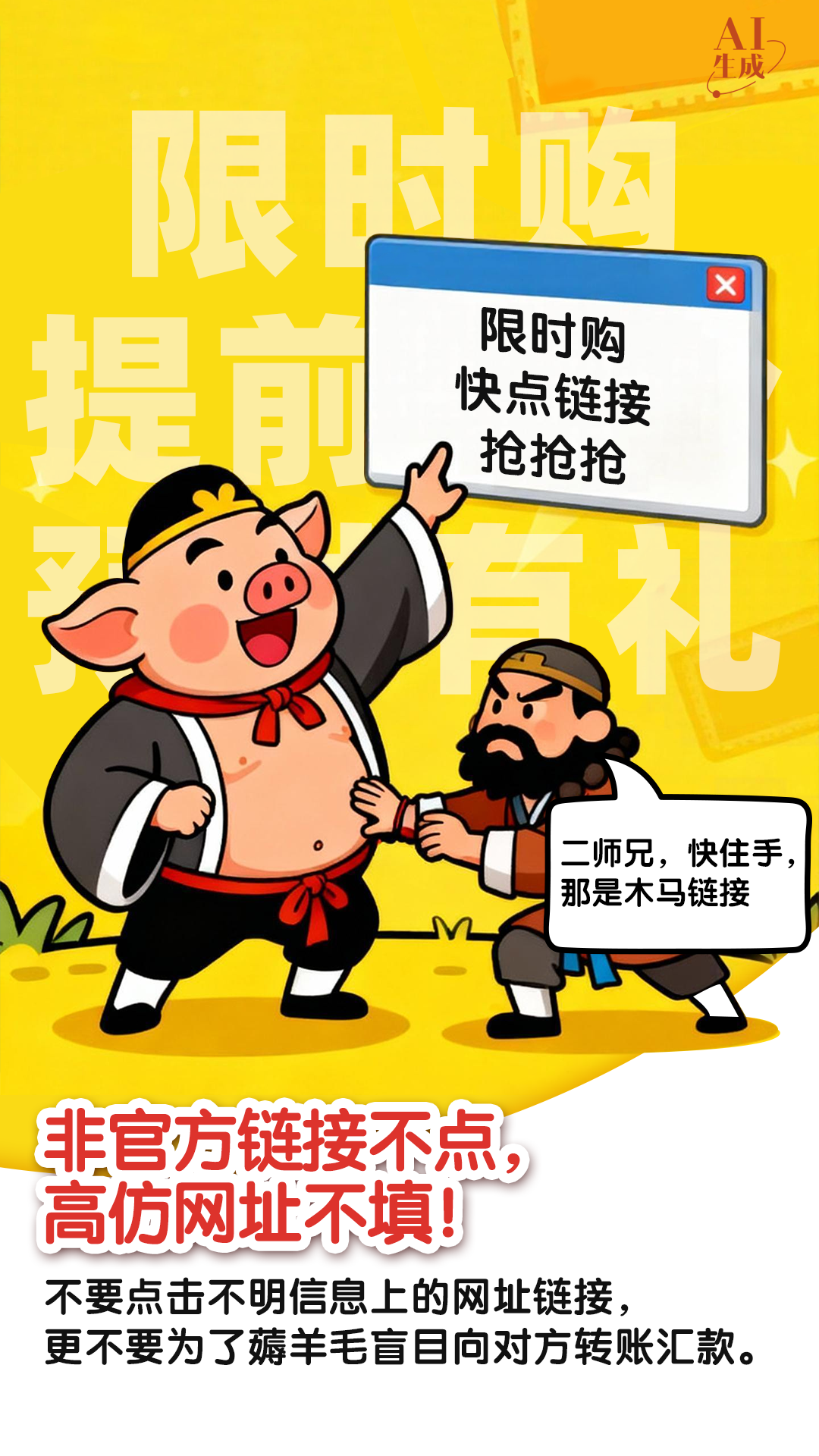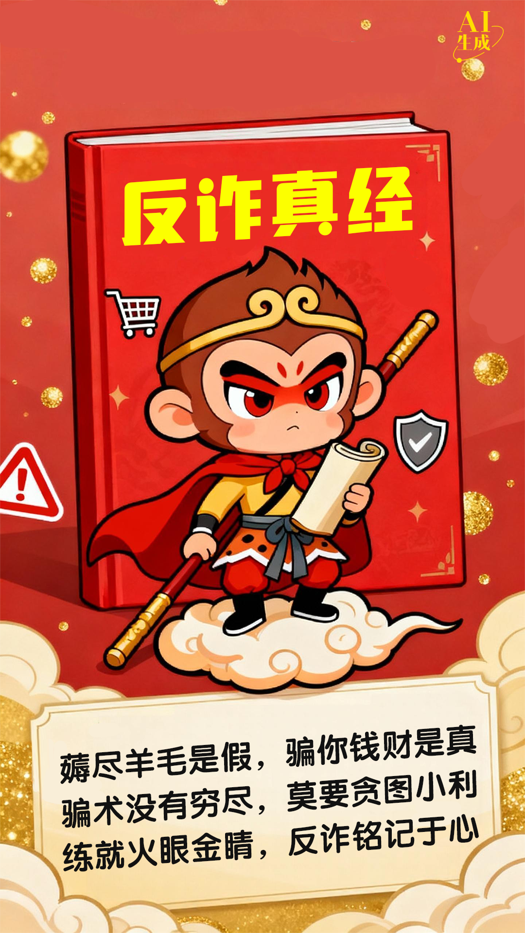 满减狂欢背后,诈骗套路暗藏!这份Q版西游主题反诈海报组来帮助你辨别:悟空火眼金睛识骗局、八戒戒贪拒诱惑、唐僧定心辨真假、沙僧稳当拦陷阱,师徒四人揭发四大双十一高发骗局,用趣味漫画+直白口诀,把防诈知识讲得通俗易懂,让你购物狂欢不踩雷,钱包稳稳当当!
