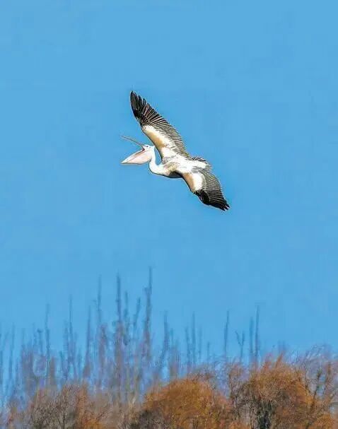 (记者 李莲)前不久,沙河水库来了一只卷羽鹈鹕。它的翼展轻松超过三米,气势非凡;若是张开大嘴,就又多了些憨萌之态。