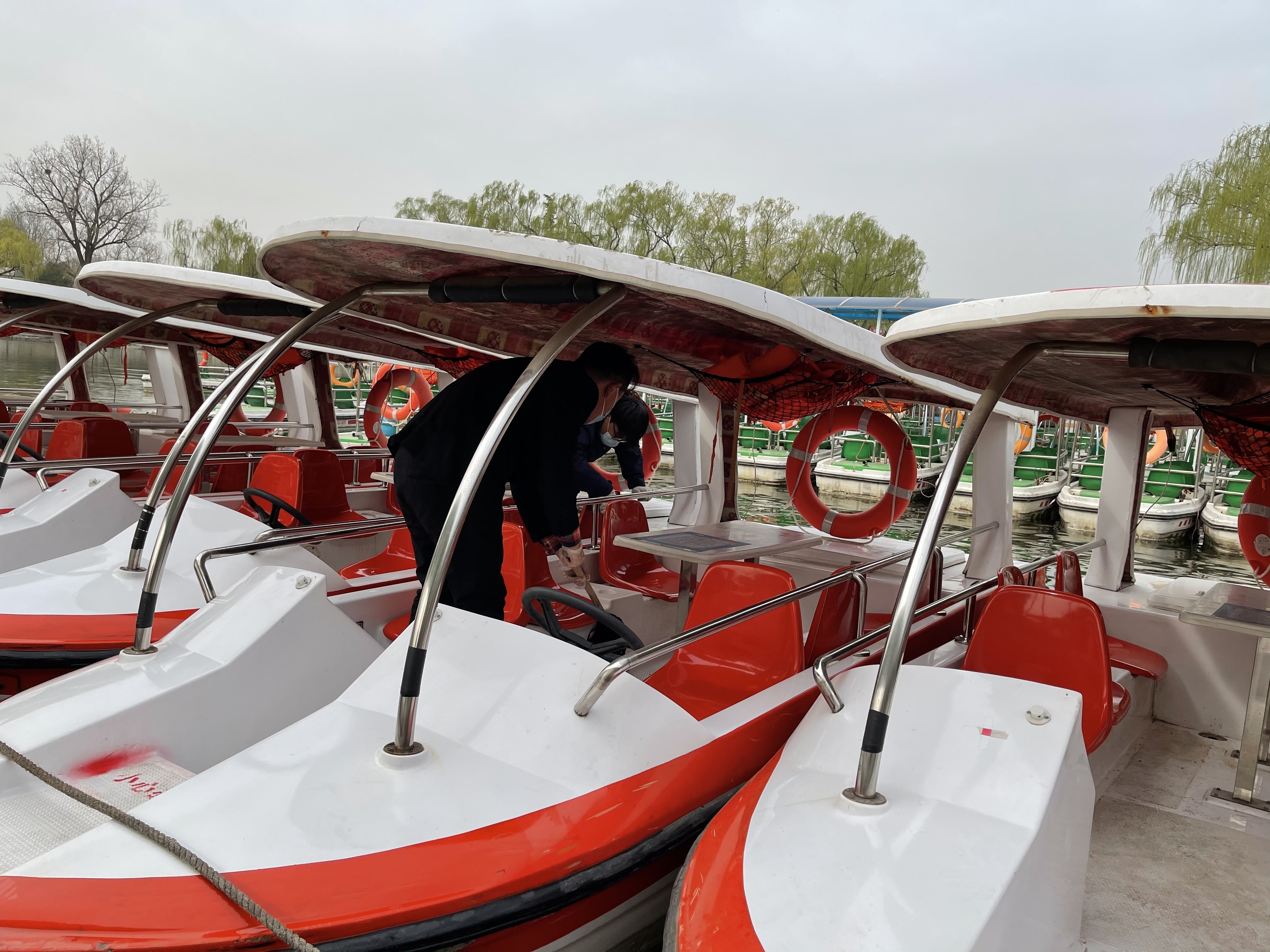 为确保每条游船正常出航,开行前,公园会对船只的动力系统、转向系统及游船外观进行反复检验,并完成一次集中消毒作业。