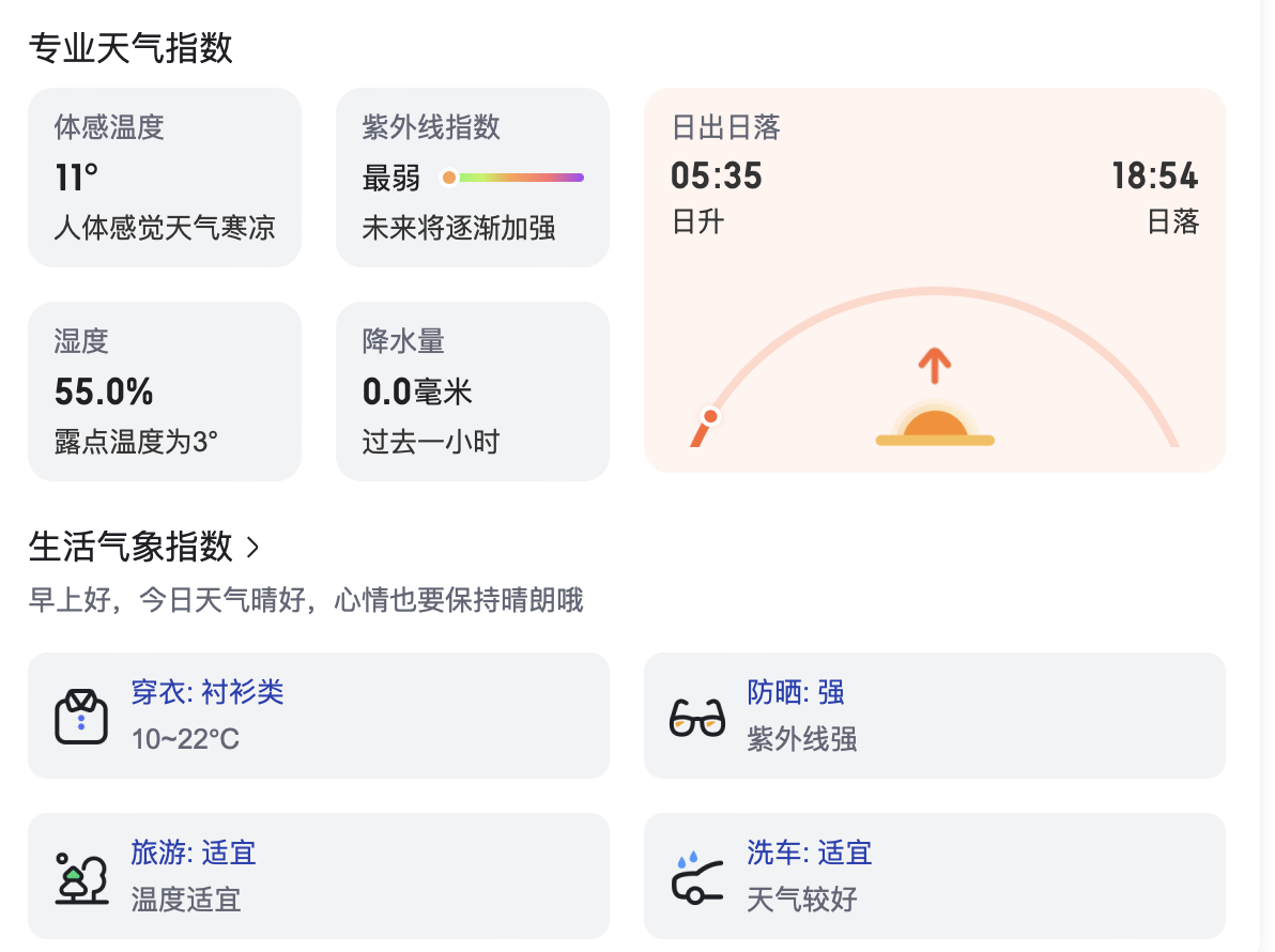 白天多云(傍晚多云间阴,山区有零星小雨或小雨),偏东风二三级,最高气温22℃;夜间多云转晴,东转北风二三级,最低气温10℃。傍晚云量较多,山区有弱降水,注意携带雨具;未来两天气温升高,但昼夜温差较大,早晚微凉,外出注意适当调整着装。