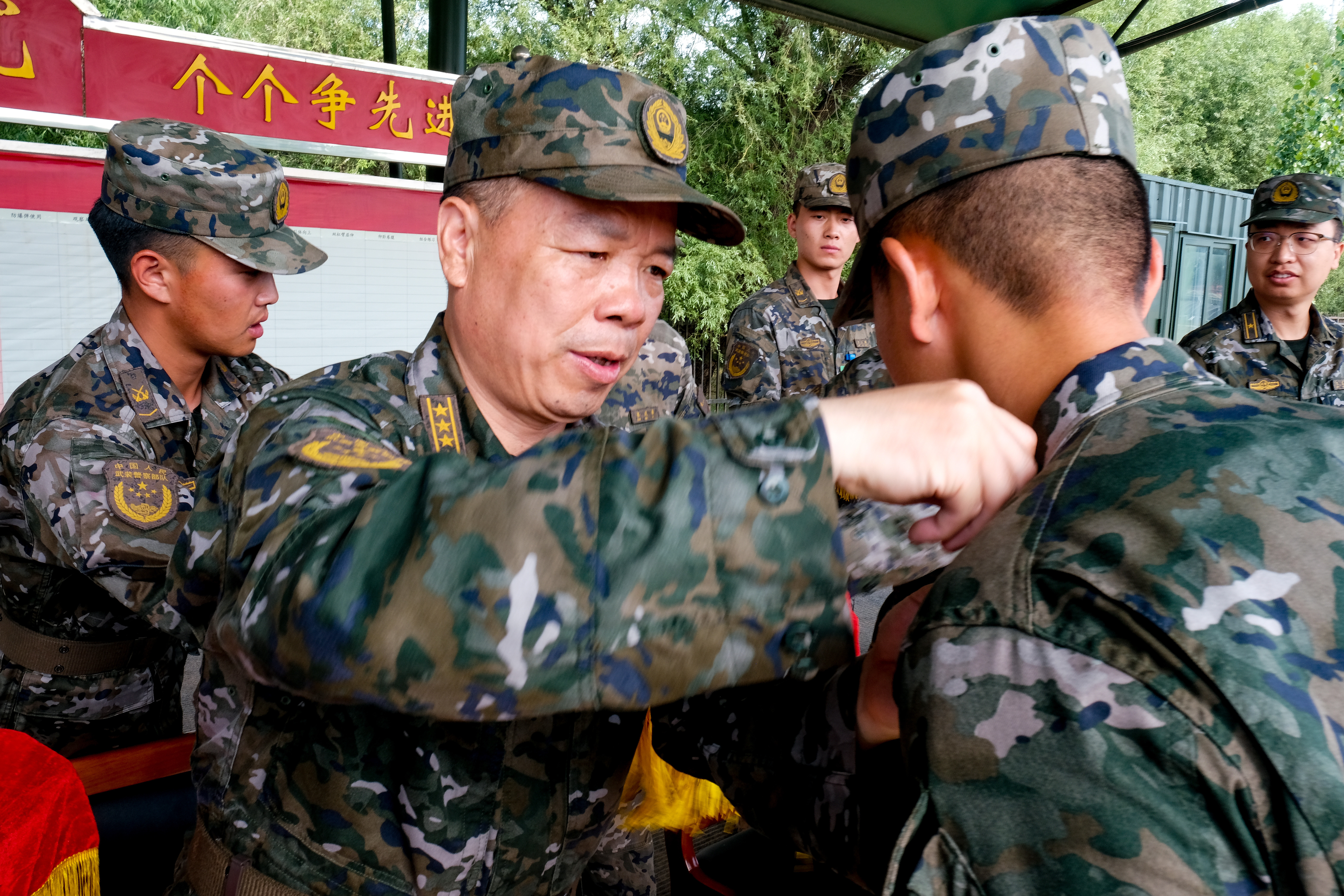 随着口令响起,三名擎旗手高举武警部队旗,迈着铿锵有力的步伐走过国旗台前,全体新兵军姿挺拔,以崇高的敬意迎接这一庄严时刻。在授衔仪式上,新兵们相互佩戴崭新的红肩章,并互敬军礼,阳光照射下,警衔闪闪发光,承载着荣誉与责任,也见证了新兵们的成长与蜕变。