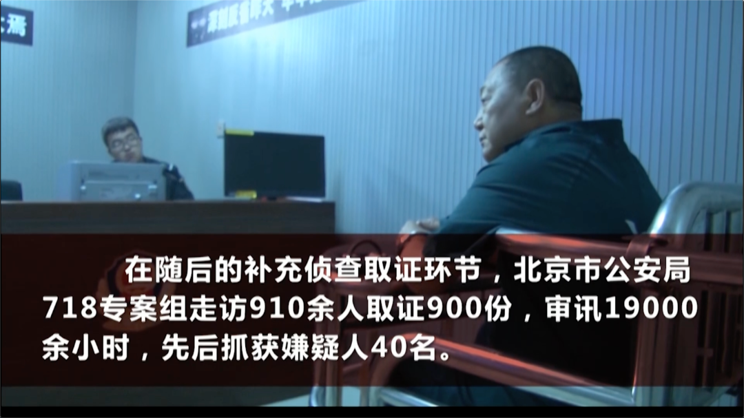 在随后的补充侦查取证环节,北京市公安局718专案组,走访910余人,取证900份,审讯共计19000余小时,先后抓获嫌疑人40名。