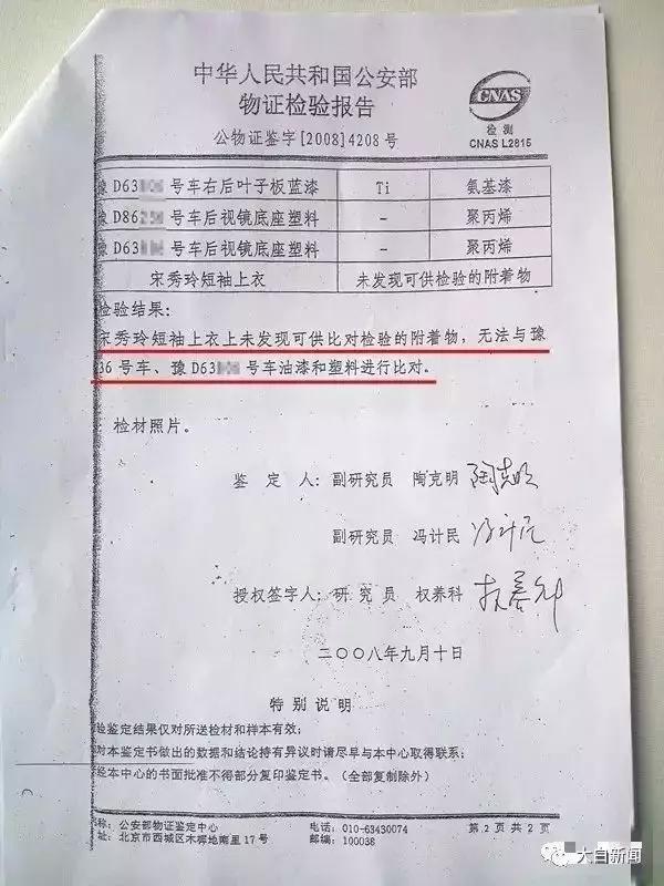 同年9月10日,公安部物证检验报告(公物证鉴字【2008】4208号)显示,宋某玲短袖上衣上未发现可供对比检验的附着物,无法与豫D-86**6号车、豫D63**6号车油漆和塑料进行比对。