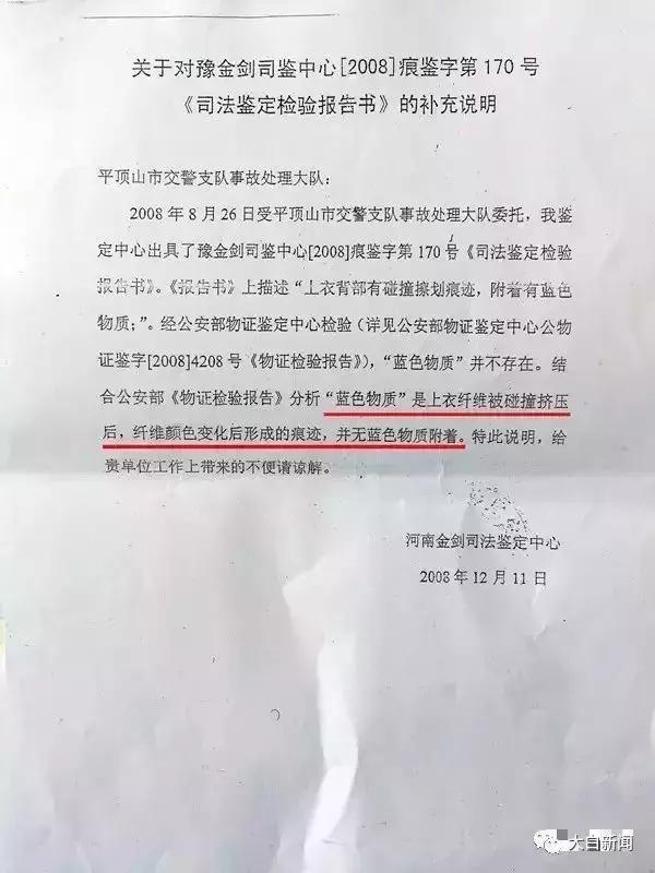 补充说明称,经公安部物证鉴定中心检验,“蓝色物质”并不存在。结合公安部《物证检验报告》分析“蓝色物质”是上衣纤维被碰撞挤压后,纤维颜色变化后形成的痕迹,并无蓝色物质附着。特此说明,给贵单位工作上带来的不便请谅解。