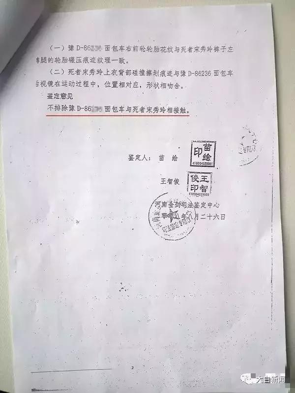 2008年8月26日,河南金剑司法鉴定中心出具的报告显示“不排除面包车与死者相接触”。但由于证据不足,疑似肇事车辆被扣押一周后即被放走。同样的物证被送检至公安部,却未发现“可供检验附着物”。