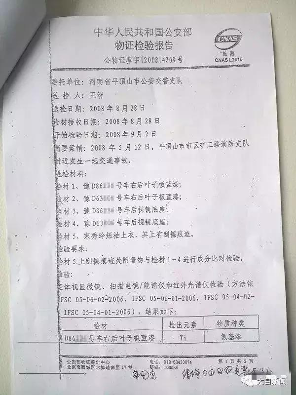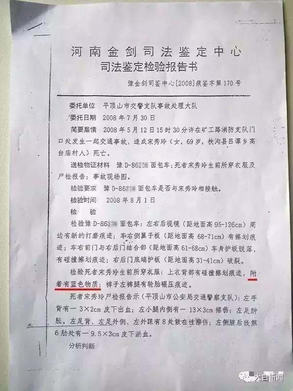 河南金剑司法鉴定中心出具的鉴定报告书显示,死者宋某某生前所穿衣服上衣背部有碰撞擦划痕迹,且“附着有蓝色物质”。齐海霞认为,这个蓝色物质是本案最重要的物证之一。她回忆到,当时交警支队曾表示,将进一步到公安部去做微量元素的认定。