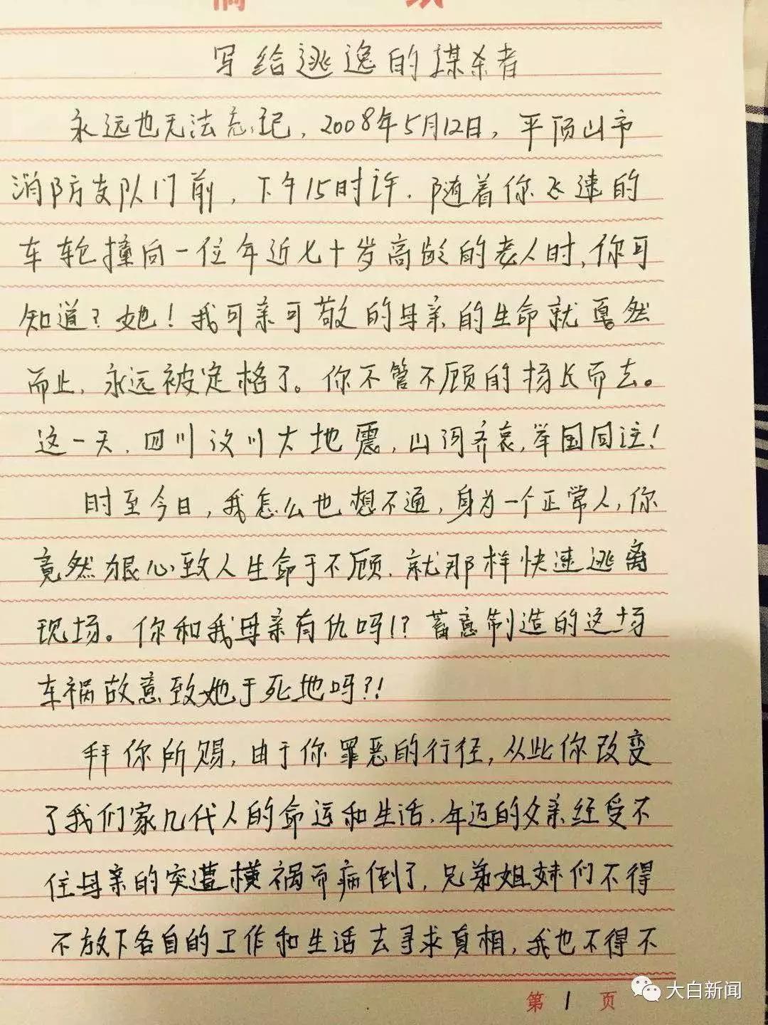 此前,大白新闻曾报道了《科级女干部替母寻凶十年,称“是爷们,就站出来”》一文。2008年5月,河南省平顶山市闹市区发生一场车祸,事发后肇事车辆逃逸,一位7旬老太宋某玲在事故中不幸遇难。事发至今,肇事车辆和司机却仍未找到。宋某玲的女儿齐海霞说:母亲的离世很奇怪,曾有神秘人想出160万让她不再继续追查此事,但被其拒绝。为寻求真相,她已经坚持为母寻凶十余年。
