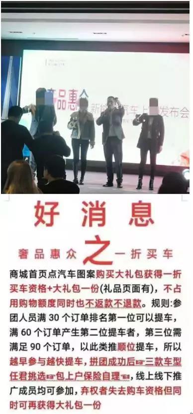奢品惠众的“鼎盛时期”出现在2019年11月之后。当时,奢品惠众对会员宣称,自己投资了新能源汽车项目。2019年11月26日,奢品惠众在重庆举行了“奢品惠众新能源汽车上线发布会”,当时网络上能查到相关消息。