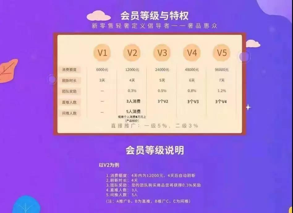 除购买商品之外,发展下线也能在奢品惠众获得佣金,下级人员可以继续发展其他下线。只要被拉进来的新会员有消费,其“上线”每次都能从其消费金额中抽取佣金、升级会员等级(如下图)。