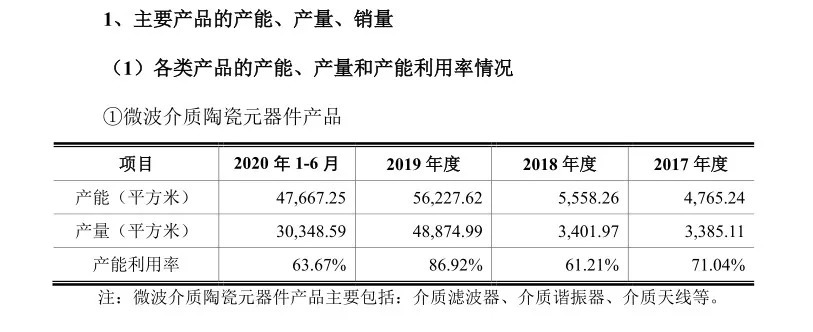 在此背景下,2020年上半年,灿勤科技核心产品微波介质陶瓷元器件产品(包括介质滤波器、介质谐振器、介质天线等)的产能利用率为63.67%,低于2019年度的86.92%,也低于其2017年的产能利用率71.04%。