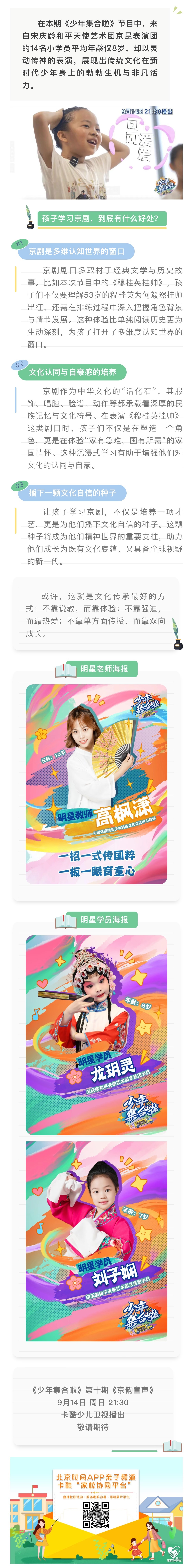 在本期《少年集合啦》节目中,来自宋庆龄和平天使艺术团京昆表演团的14名小学员平均年龄仅8岁,却以灵动传神的表演,展现出传统文化在新时代少年身上的勃勃生机与非凡活力。