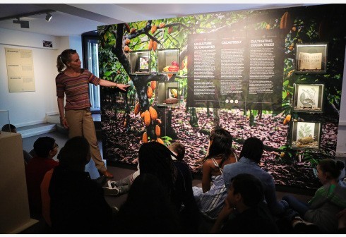 6月9日,在比利时布鲁塞尔的“比利时巧克力村”,工作人员为参观者讲解“种植可可树”的知识