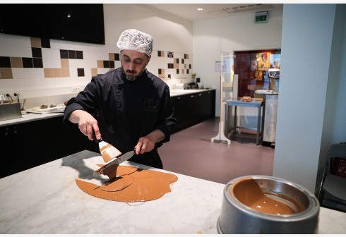 工作人员演示巧克力制作过程