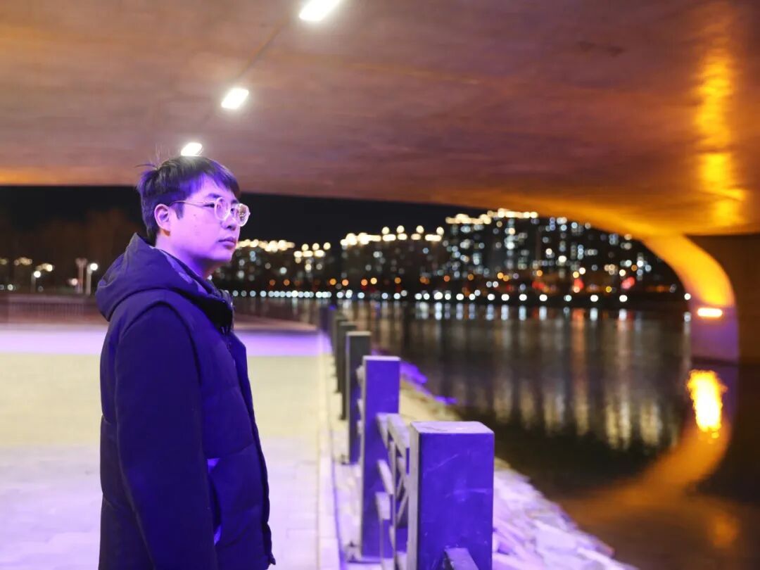 王新宇在俸伯桥下查看附近楼体景观照明情况。