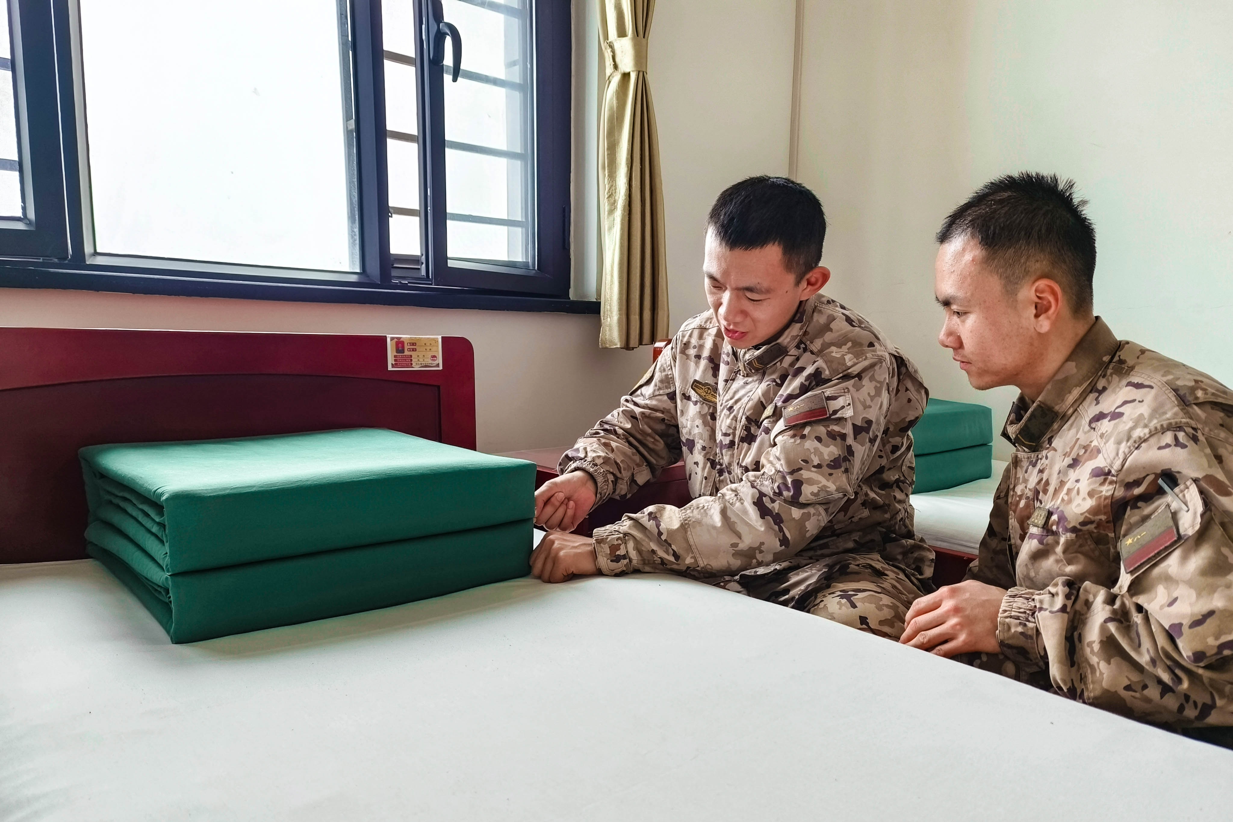 “想要被子叠的好,首先三折得叠好”“捏线的时候,可以先捏一条粗线然后在掐一条细线,这样线就不会偏了。”班宿舍里,老兵正在向班里的新兵教授叠被子的技巧,帮助新兵掌握叠“豆腐块”这门军营必备“手艺”。