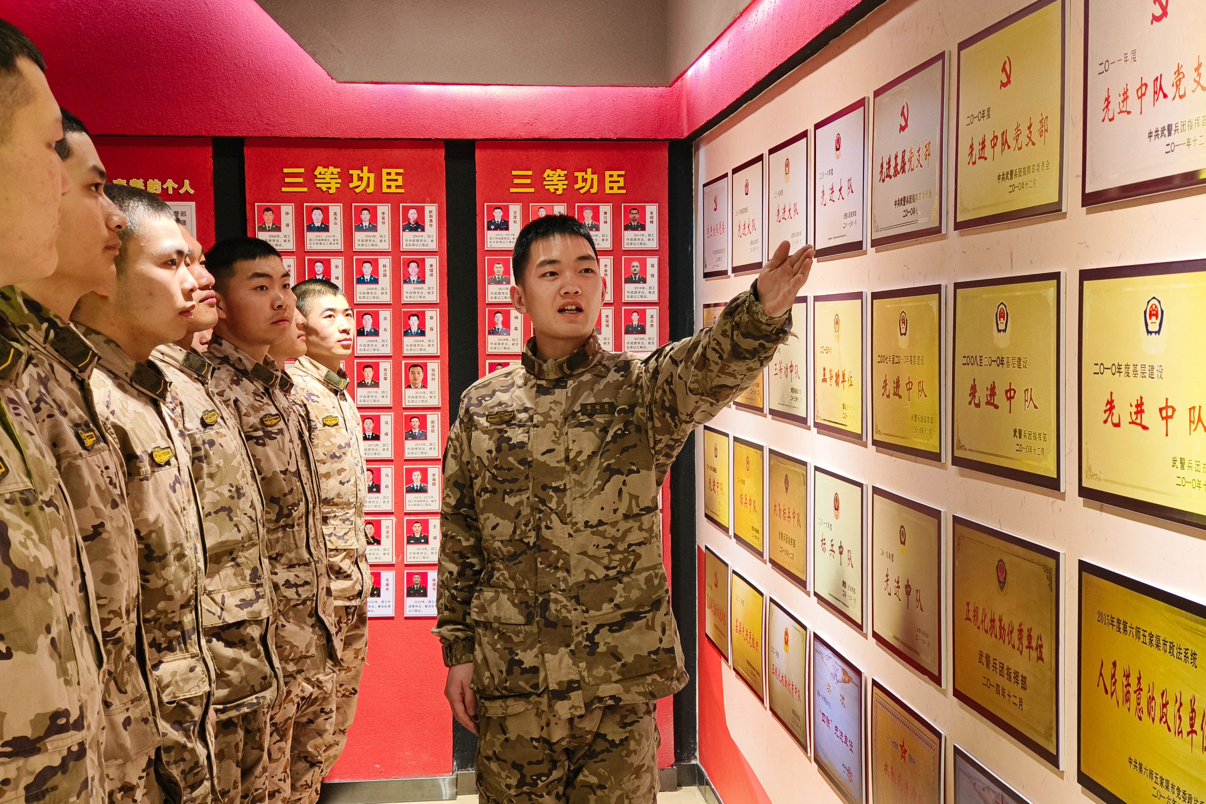 在大队荣誉室里,映入眼帘的是满墙的锦旗、奖状以及陈列整齐的文物。这些无声的展品见证了部队从成立之初到如今的峥嵘岁月。老兵蔡嗣煜站在荣誉墙前,向新兵们讲述了奋斗的故事,将红色基因和军人精神传递给新一代的接班人。新兵张派派听得入神,他感慨地说:“原来我们的部队有这么光荣的历史!作为新时代的军人,我一定会继承这种精神,为部队争光。”