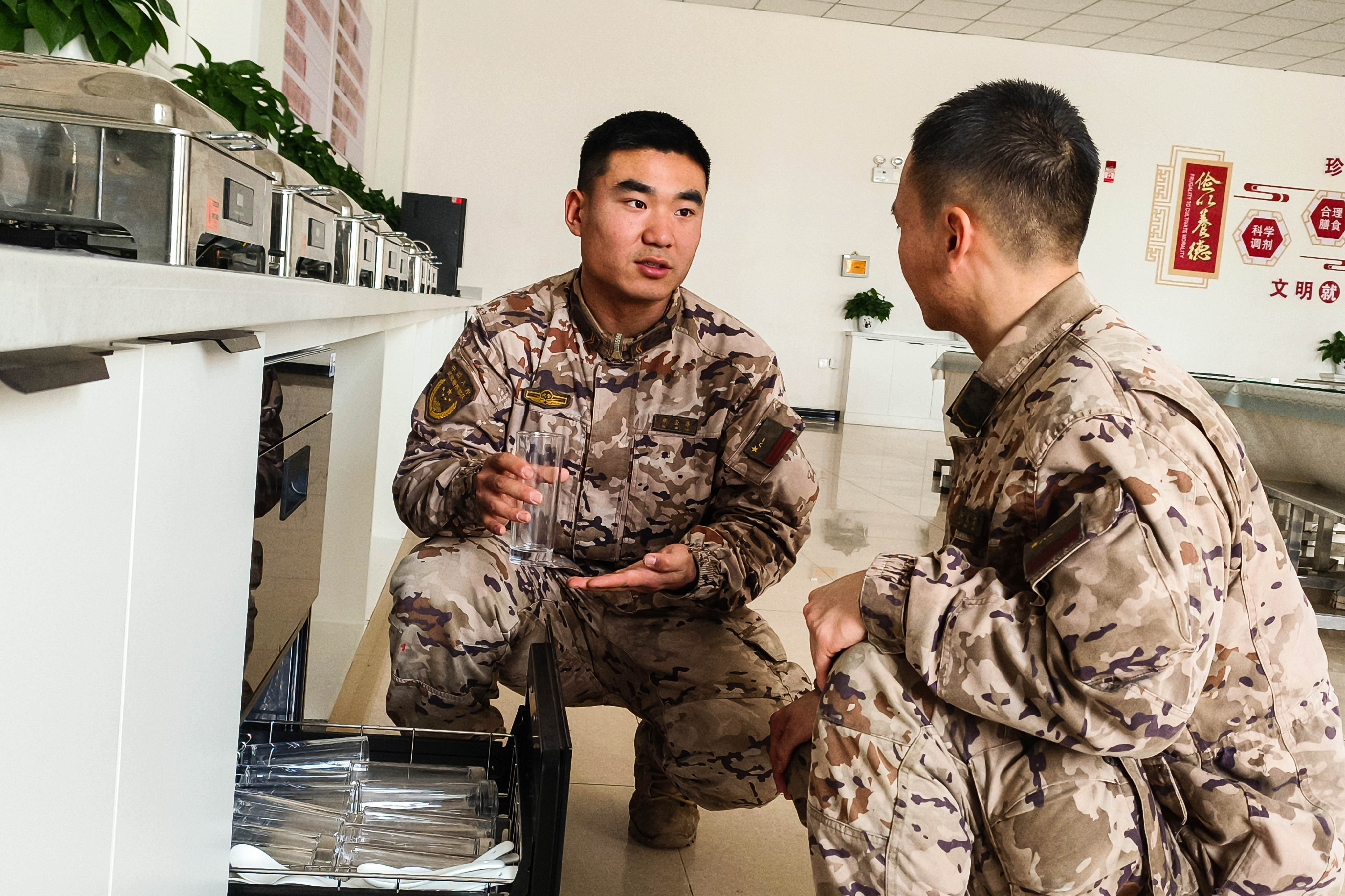 “消毒柜是保证餐具卫生的重要设备,消毒时间一般为50至60分钟,里面杯子要码放整齐……”在餐厅,即将退伍的老兵胡金涛将自己负责餐厅环境与卫生期间总结的经验和设施的操作规范,对新同志倾囊相授。