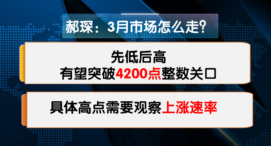 现场嘉宾郝琛认为,3月市场先低后高,有望突破4200点整数关口:
