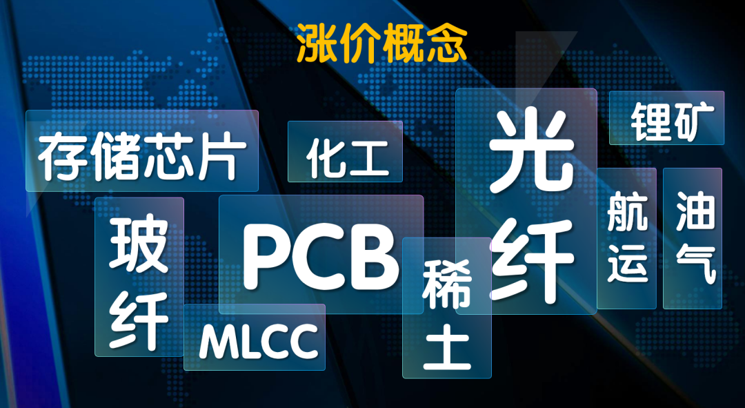 现场嘉宾郝琛表,看似轮动,其实涨价概念是明确的主线机会:存储芯片、PCB、MLCC、光纤、玻纤、稀土、化工、锂矿、航运、油气等。