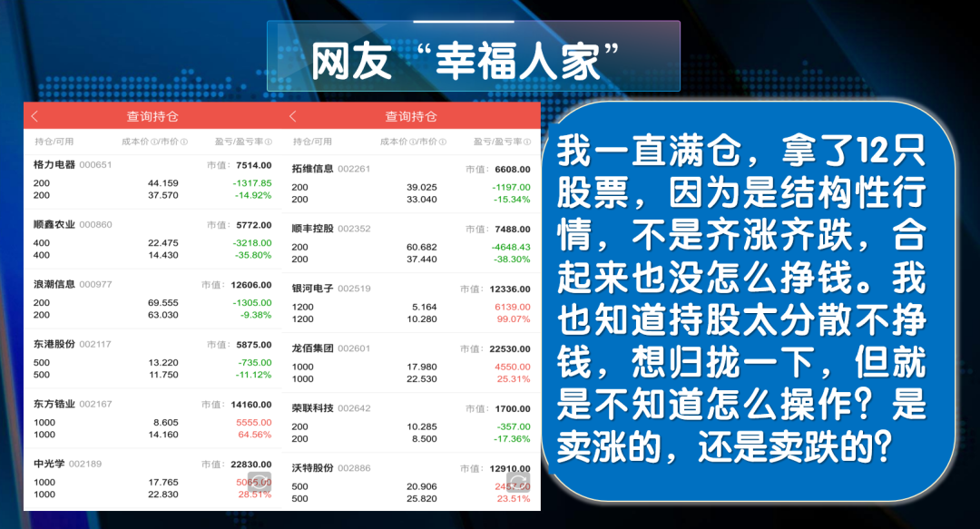 网友“幸福人家”:我一直满仓,拿了12只股票,因为是结构性行情,不是齐涨齐跌,合起来也没怎么挣钱。我也知道持股太分散不挣钱,想归拢一下,但就是不知道怎么操作?是卖涨的,还是卖跌的?