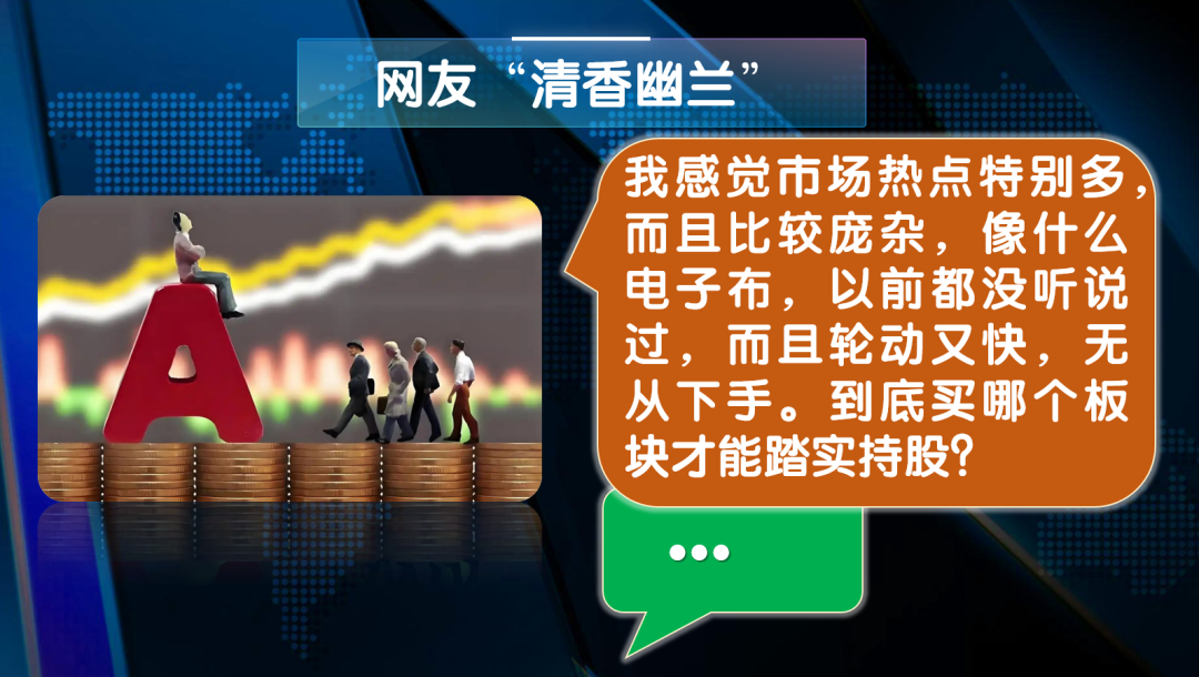 网友“清香幽兰”:我感觉市场热点特别多,而且比较庞杂,像什么电子布,以前都没听说过,而且轮动又快,无从下手。到底买哪个板块才能踏实持股?