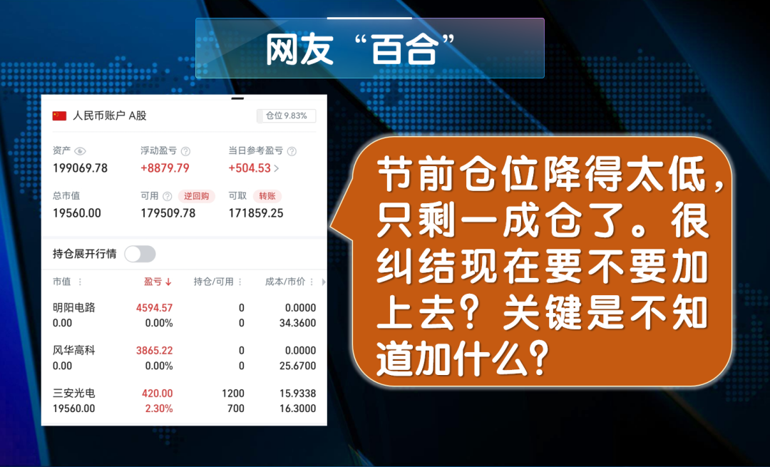 网友“百合”留言:节前仓位降得太低,只剩一成仓了。很纠结现在要不要加上去?关键是不知道加什么?