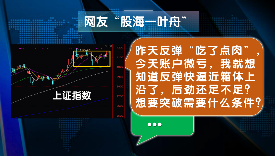 网友“股海一叶舟”说出了很多人的心声:昨天反弹“吃了点肉”,今天账户微亏,我就想知道反弹快逼近箱体上沿了,后劲还足不足?想要突破需要什么条件?